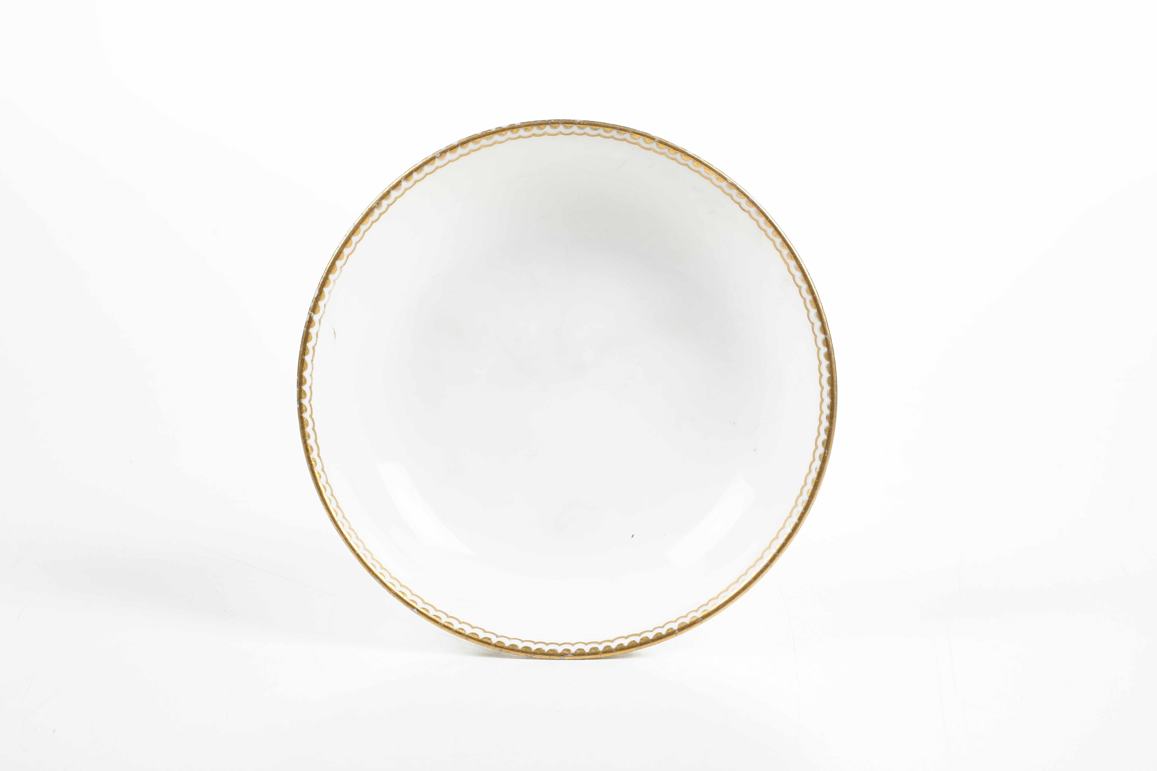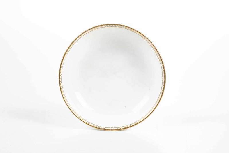 Al lotto si aggiunge un piattino di Sèvres del XVIII secolo; porcellana bianca con bordo in oro (diametro cm 13,5; felature)