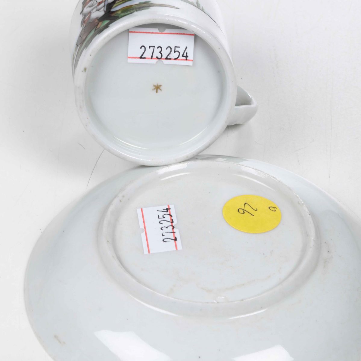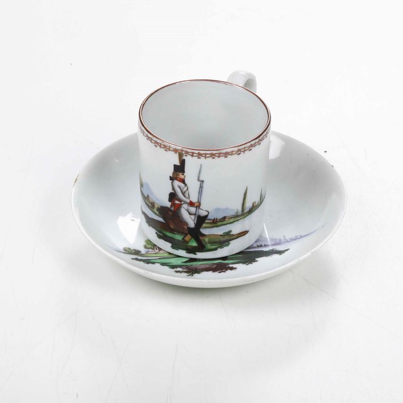 Porcellana. Marca: stella in oro sotto la tazza. Altezza tazza cm 5,6; diametro piattino cm 11,5. Conservazione: ottima; oro al bordo del piattino completamente usurato