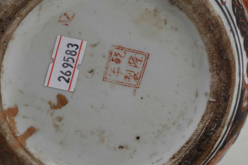 Coppia di potiches in porcellana Imari con decori floreali e soggetti naturalistici entro riserve, Cina, Dinastia Qing, [..]