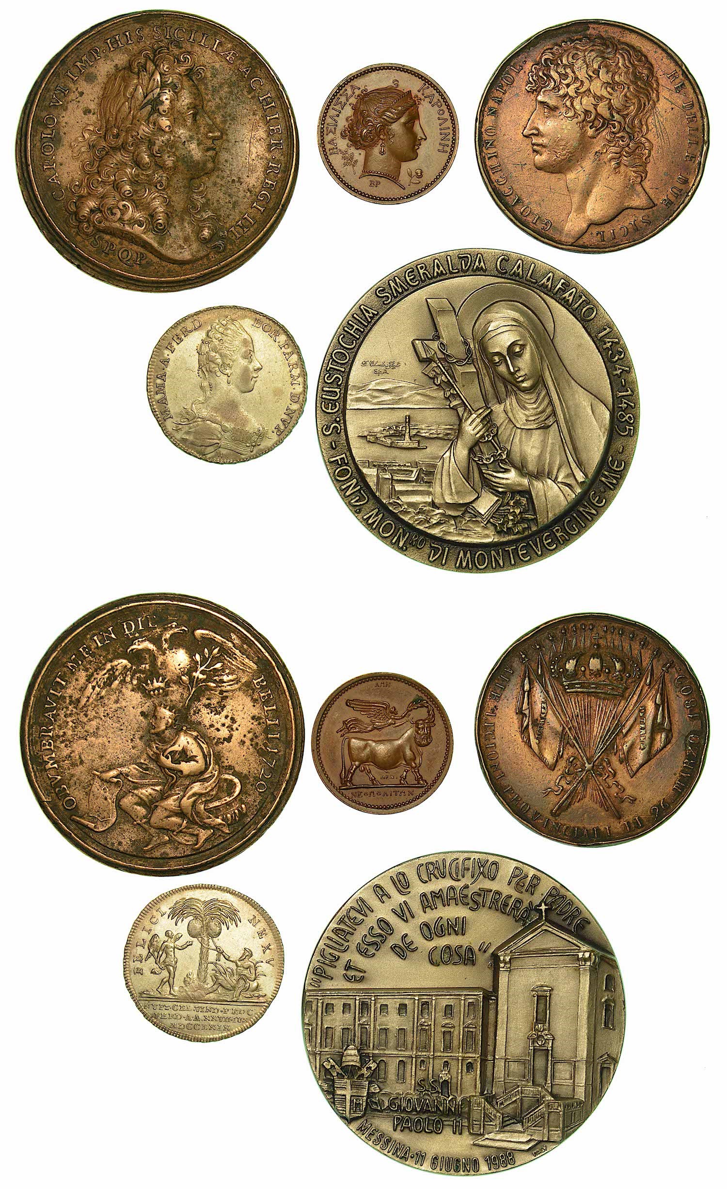 PALERMO. CARLO VI, 1720-1734. Medaglia in bronzo 1720. Omaggio del Senato di Palermo, acclamato III Re di Sicilia e Gerusalemme. Opus A. Travani. Siciliano 94. Forrer VI-128. Molto Rara. g. 31,66. Diam. mm. 44,5. Fusione. MB - REGNO DELLE DUE SICILIE. GIOACCHINO MURAT, 1808-1815. Medaglia in bronzo 1809. Agli organizzatori delle legioni provinciali. Opus Rega e D’Andrea?. Ricciardi 82. Siciliano 23. Essling 2550. Bramb. p. 87. Julius 2071/2. Bramsen 842. D’Auria 87. Diam. mm. 37,5. Fusione pulita. - CONQUISTA DI NAPOLI. Medaglia in bronzo 1806. Opus J. B. Andrieu e A. Brenet. Julius 1557. Essling 1129. Bramsen 516. SPL - PARMA. FERDINANDO I, 1765-1802. Medaglia in metallo bianco 1769. Per il matrimonio fra l'arciduchessa Maria Amalia e Ferdinando I di Borbone. Mont. 1998. BB - VATICANO. GIOVANNI PAOLO II, 1978-2005. Medaglia in metallo bianco per la fondazione Monastero di Montevergine Messina.