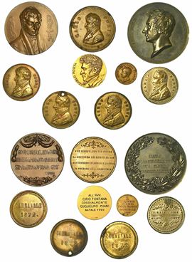 Esemplari del XIX e XX secolo. Oro e altri metalli (medaglia in oro di titolo 750, peso g. 10,83). Condizioni mediamente buone.
