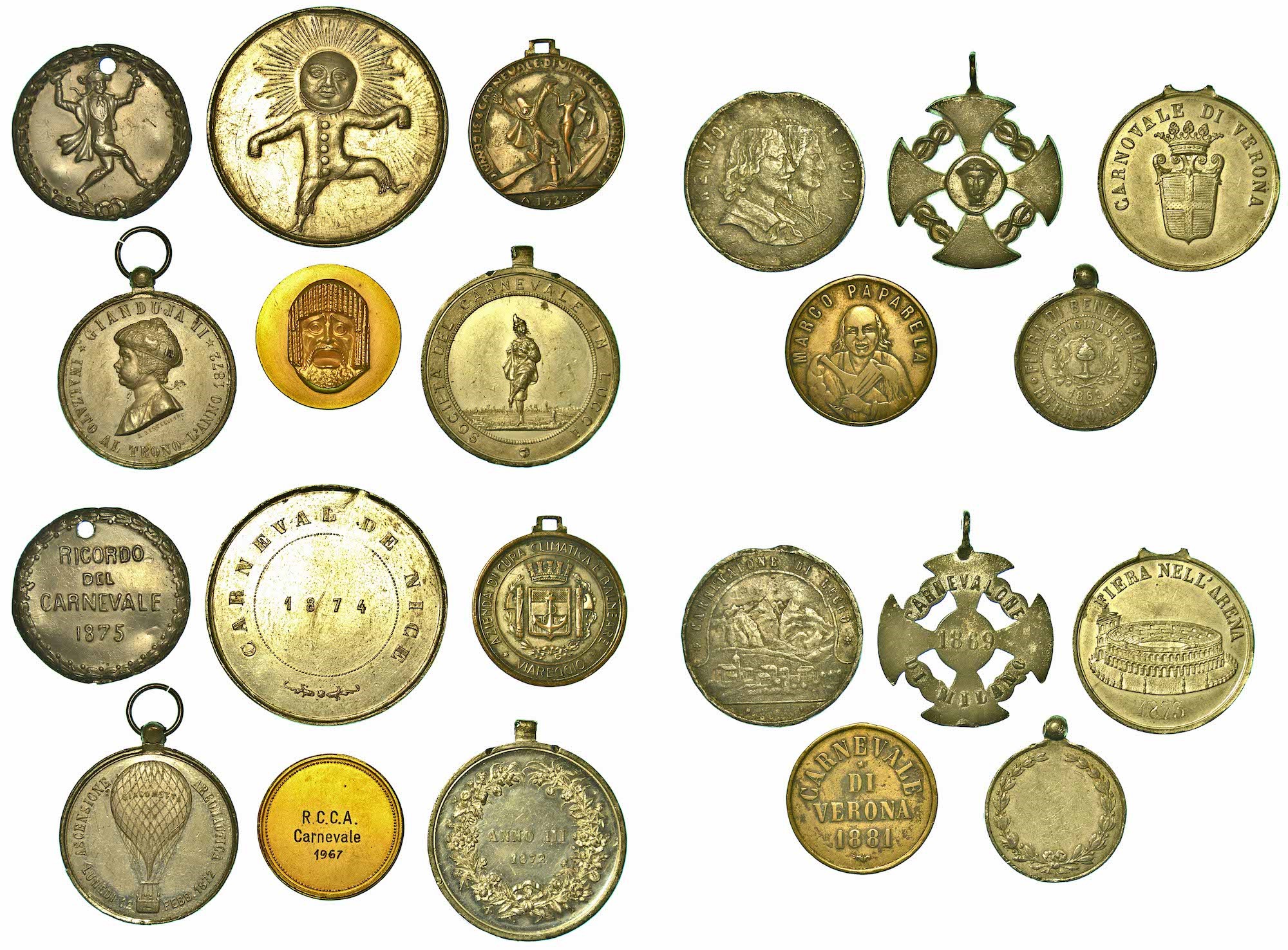 Selezione di esemplari di argomento carnevalesco perlopiù della fine del 1800 e della prima metà del 1900, con alcune maschere della tradizione italiana. Metalli vari. Conservazione mediamente buona.
