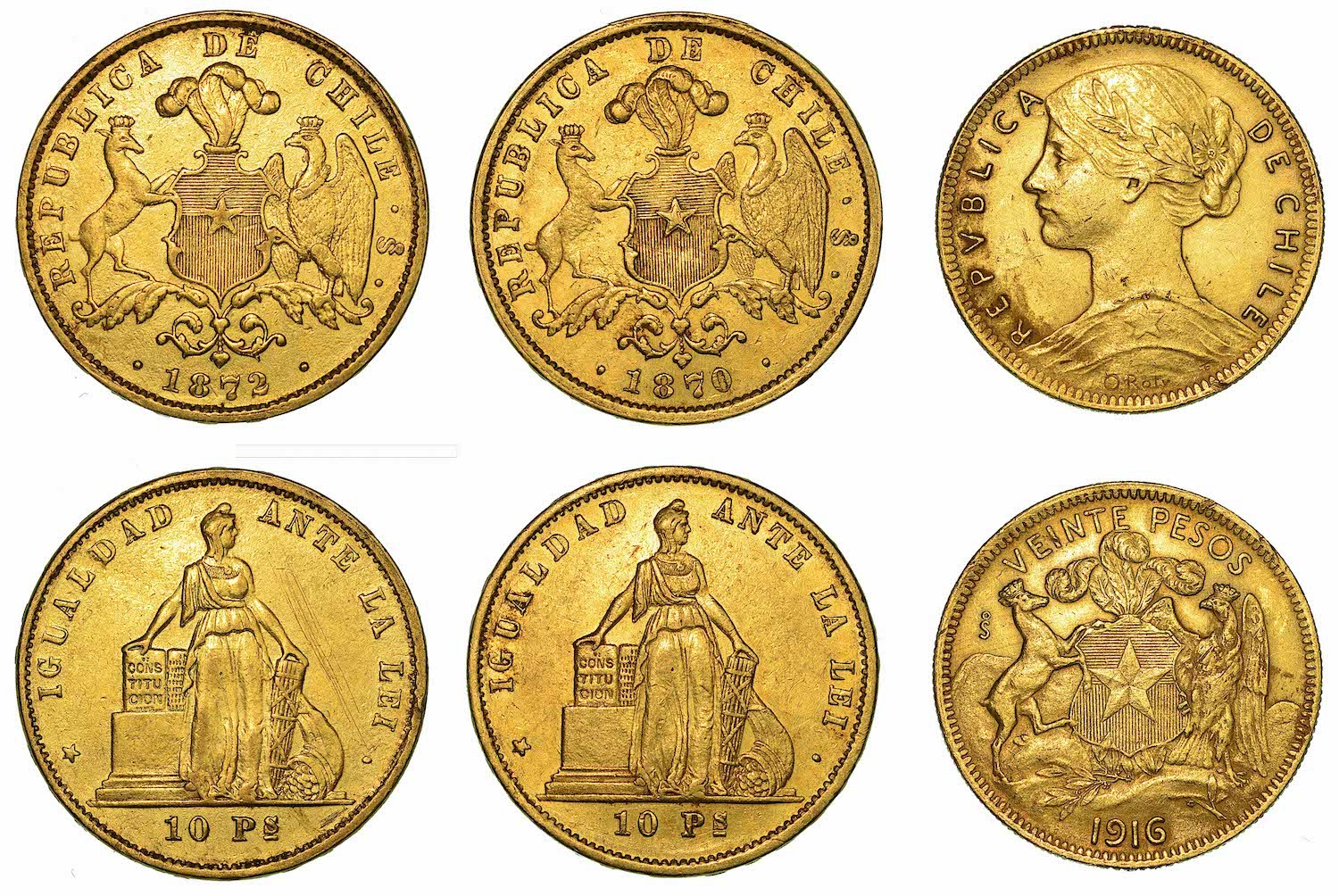 20 Pesos 1916. Friedb. 51. g. 11,99. Diam. mm. 26,82. Oro. q.BB (traccia di appiccagnolo) - 10 Pesos 1870. Friedb. 45. g. 15,26. Diam. mm. 28,50. Oro. BB - 10 Pesos 1872. Friedb. 45. g. 15,26. Diam. mm. 28,50. Oro. q.BB