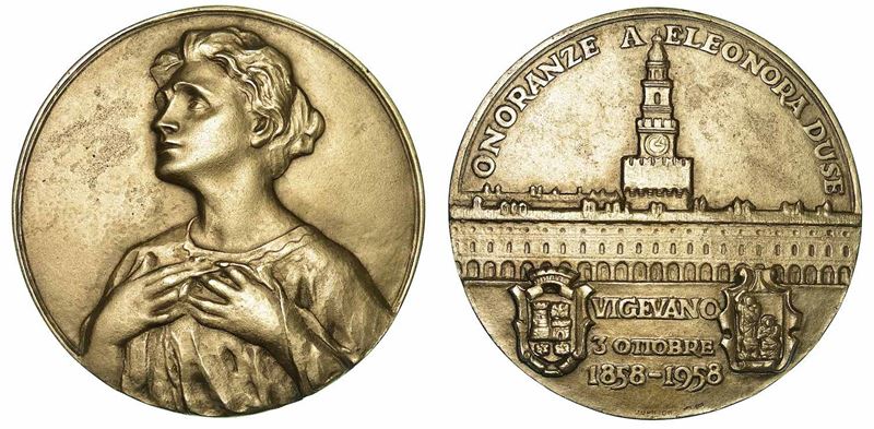 Vigevano onora la cantante. Dittico in argento e bronzo. Busto di tre quarti della cantante. R/ Veduta frontale del castello di Vigevano. Opus Johnson. g. 575 (argento) - g. 571 (bronzo). Diam. mm. 113,78. SPL - Medaglia in bronzo. Busto di tre quarti della cantante. R/ Figura femminile rivolta a s. Opus Vitt. Caimi, Como. g. 104,52. Diam. mm. 64,33. q.SPL