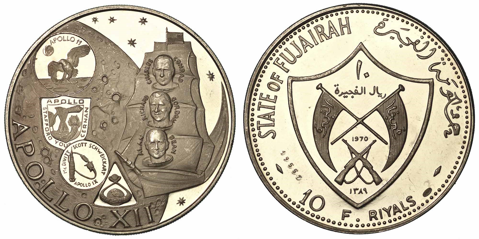 Busti dell’equipaggio dell’Apollo XII su veliero; sullo sfondo, luna. R/ Stendardi e fucili incrociati entro scudetto. KM# 5. g. 29,76. Diam. mm. 45,15. Arg. (titolo 1000). q.FDC.