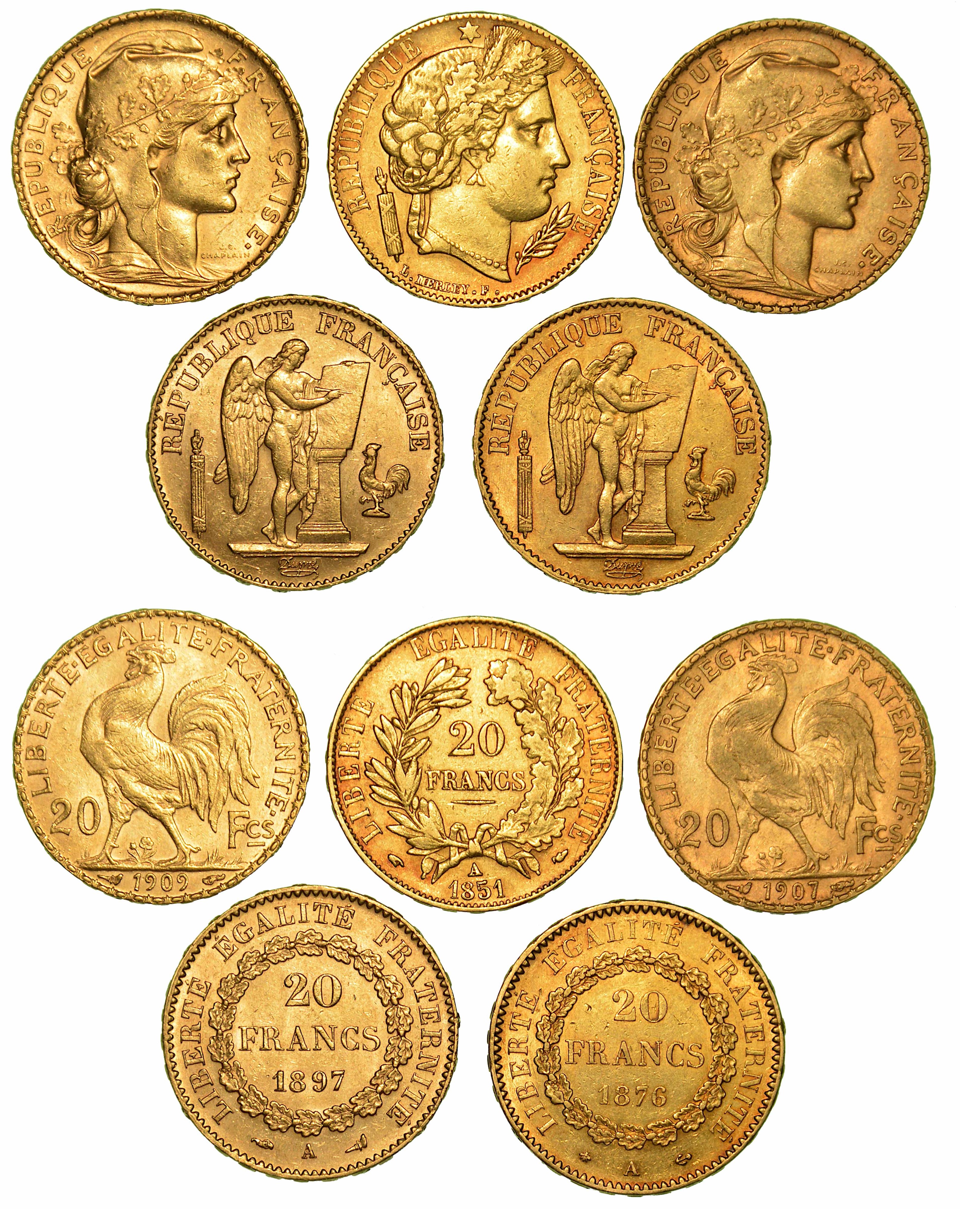 DEUXIEME/TROISIEME REPUBLIQUE. 20 Francs 1851 - 1876 - 1897 - 1907 - 1909. g. 6,45. Diam. mm. 21,10. Oro. Conservazioni da MB/BB a SPL.