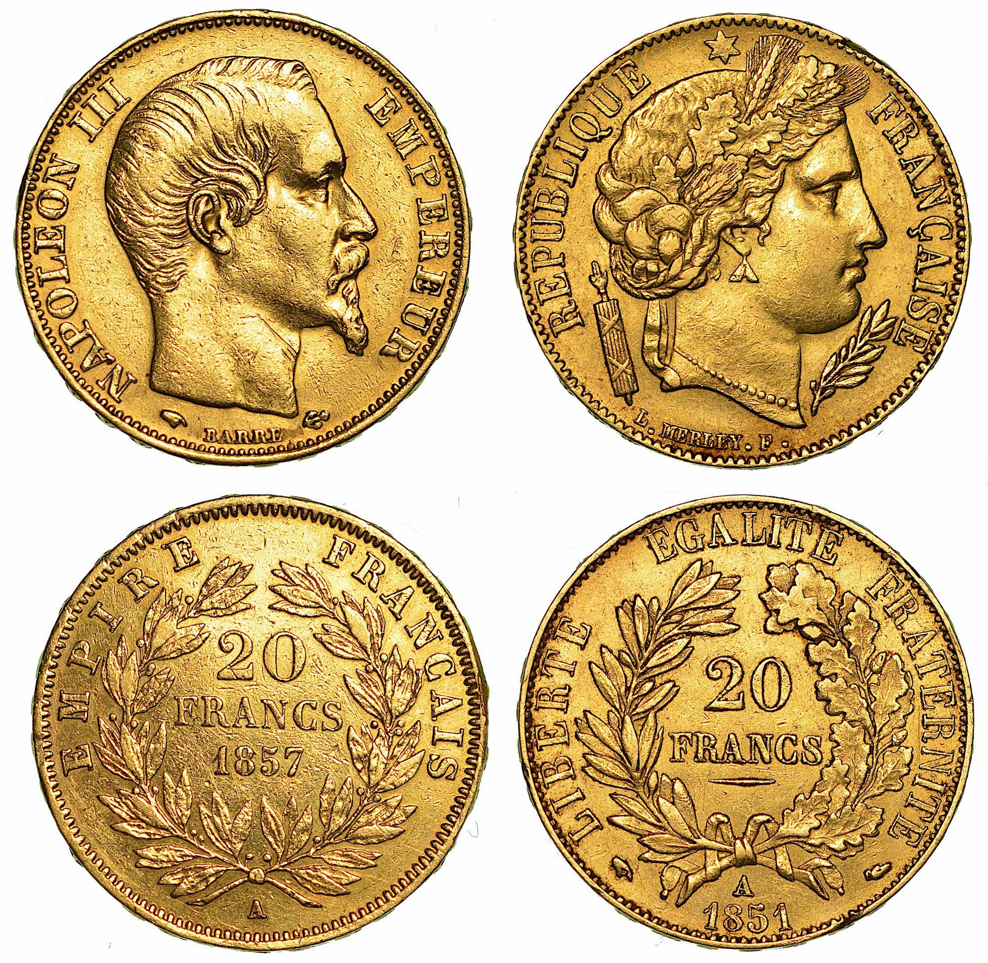 NAPOLEON III, 1852-1870. 20 Francs 1857 (Parigi). Testa a d. R/ Valore e data entro corona di alloro. Friedb. 573. g. 6,44. diam. mm. 21,21. Oro. MB/BB (traccia di appiccagnolo) - DEUXIEME REPUBLIQUE, 1848-1852. 20 Francs 1851. Friedb. 566. g. 6,44. Diam. mm. 21,18. Oro. BB (colpi)