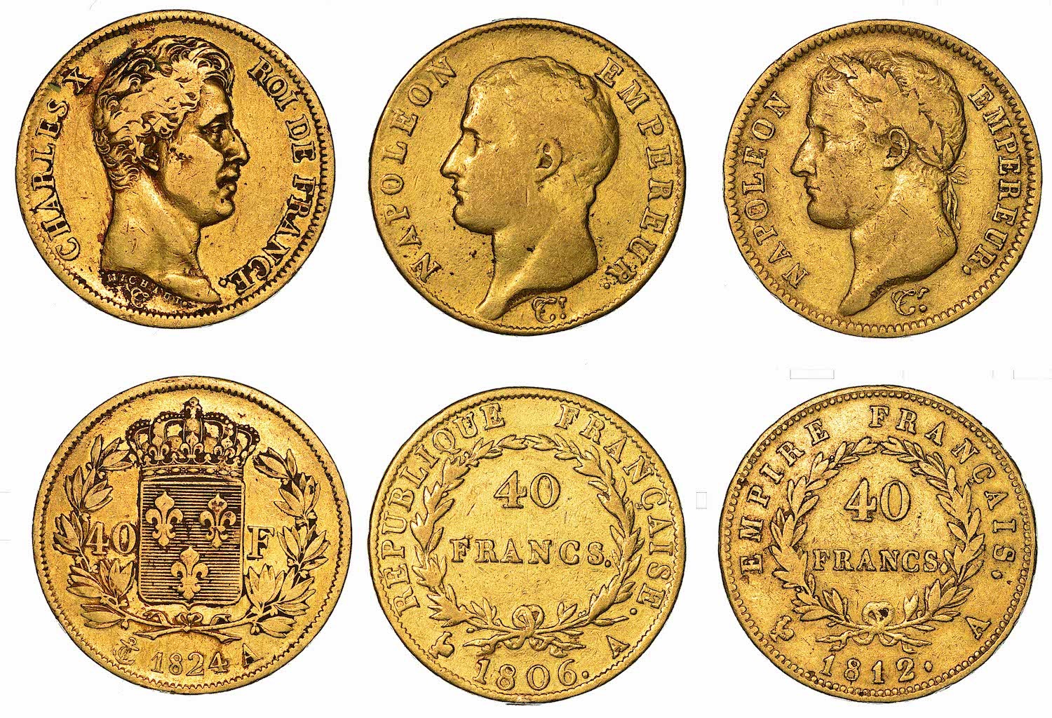 NAPOLEON I, 1801-1815. 40 Francs 1806 (Parigi). Friedb. 481. g. 12,74. Diam. mm. 25,99. Oro. B/MB (traccia di appiccagnolo) - 40 Francs 1812 (Parigi). Friedb. 505. g. 12,80. Diam. mm. 26,02. Oro. MB - CHARLES X, 1824-1830. 40 Francs 1824 (Parigi). Friedb. 547. g. 12,66. Diam. mm. 26,02. Oro. MB