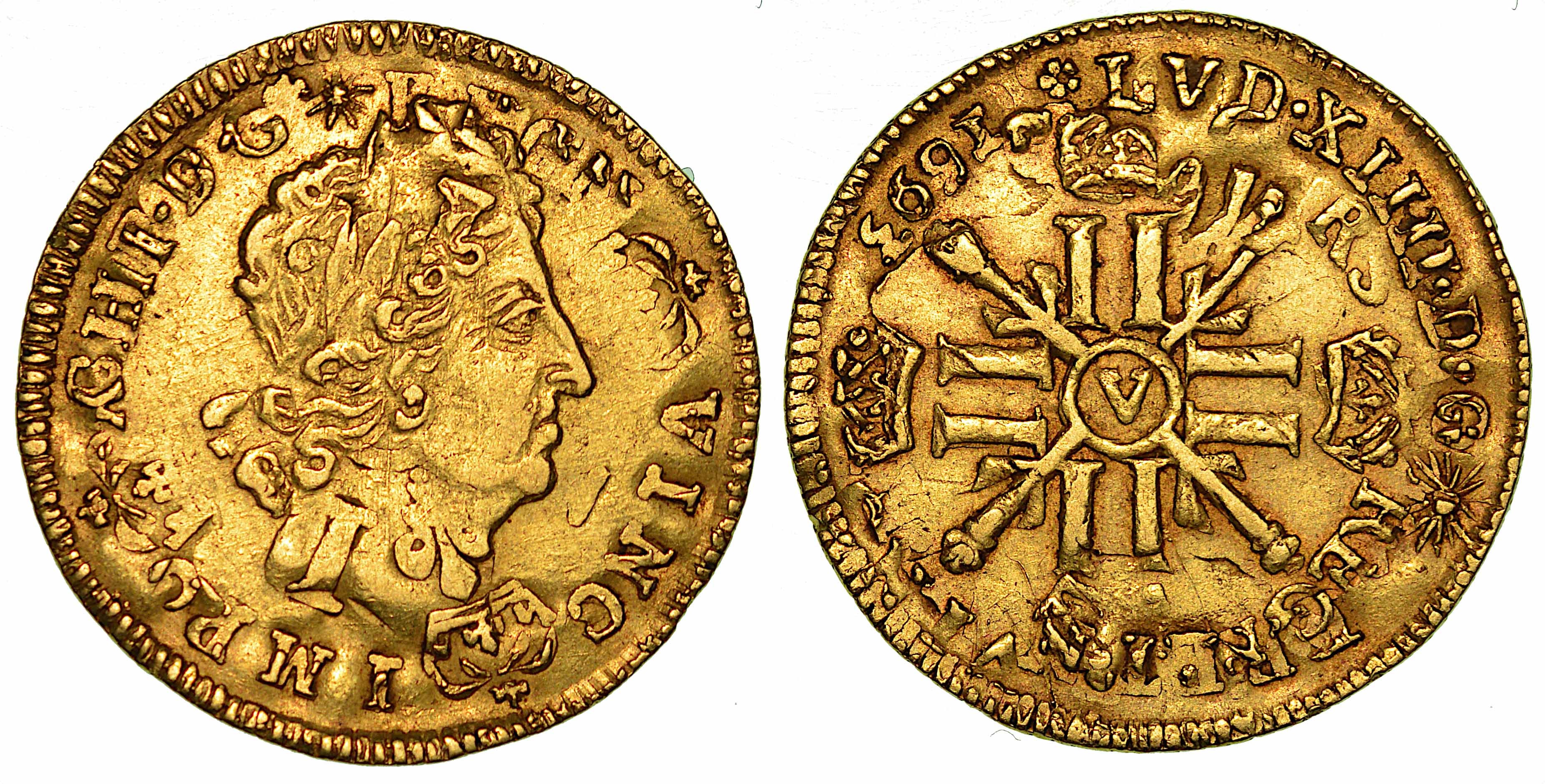 FRANCIA. LOUIS XIV, 1643-1715. 1/2 Louis d'or 1693 (tipo con otto L). Troyes.
