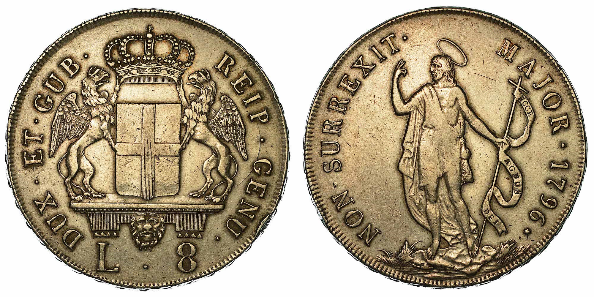 GENOVA. DOGI BIENNALI E GOVERNATORI DELLA REPUBBLICA, 1528-1797. SERIE DELLA III FASE, 1637-1797. 8 Lire 1796.