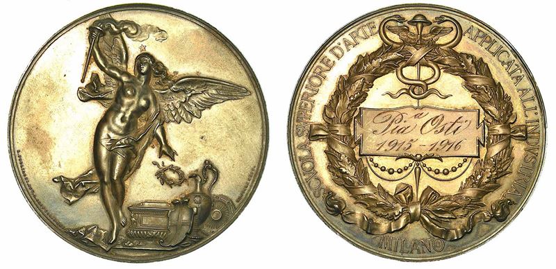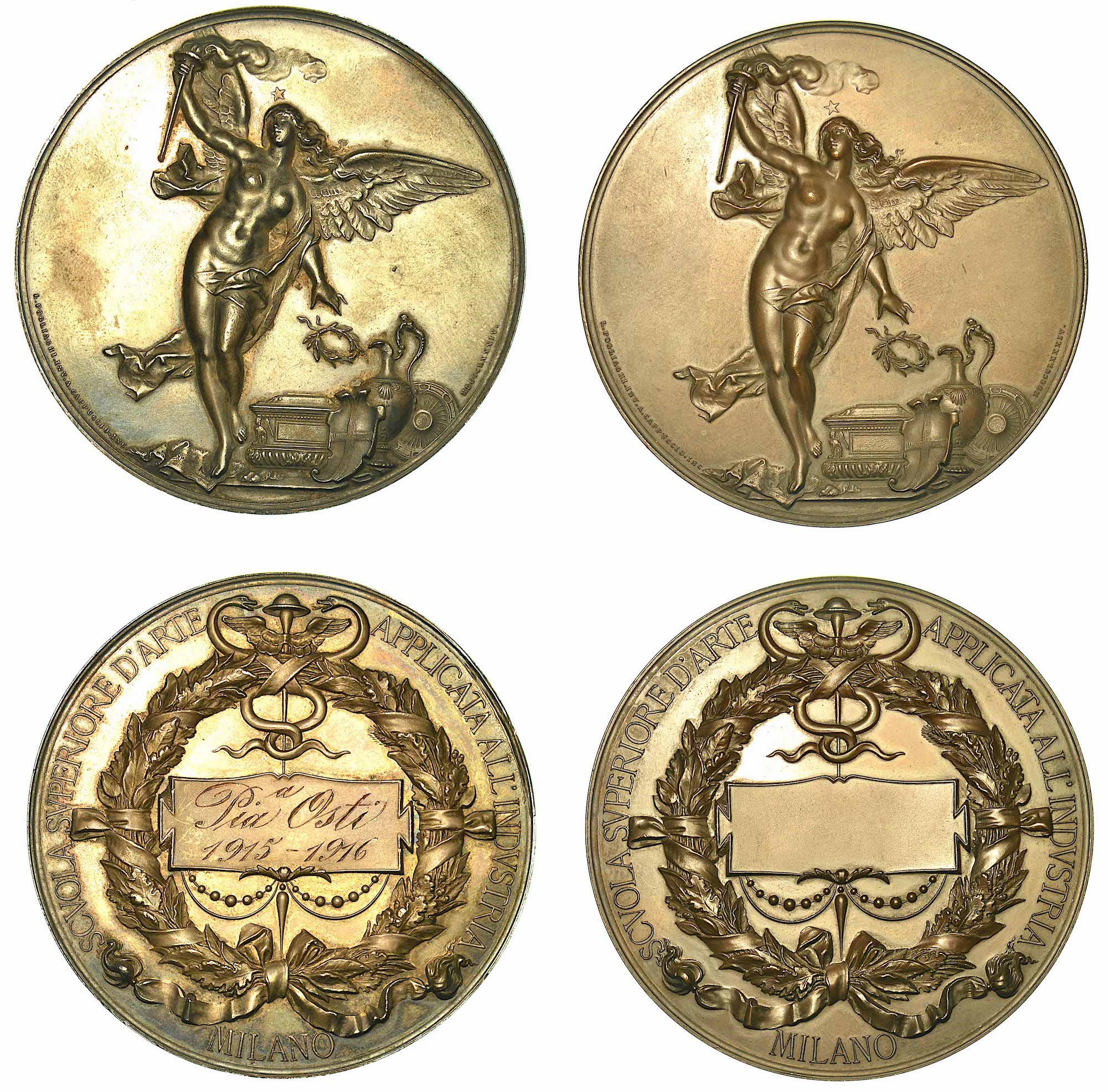 Angelo alato eleva torcia accesa. In basso urna, anfora e stemma della città. R/ Corona di alloro chiusa da nastro e caduceo alato intorno a targa con incizione "a Pia Osti 1915-1916" (solo argento). Opus L. Pogliaghi - A. Cappuccio. g. 246,14 (argento) - g. 170,07 (bronzo). Diam. mm. 72,35. Lievi segni di contatto sui bordi (colpo abilmente ripreso nell'argento) SPL/FDC