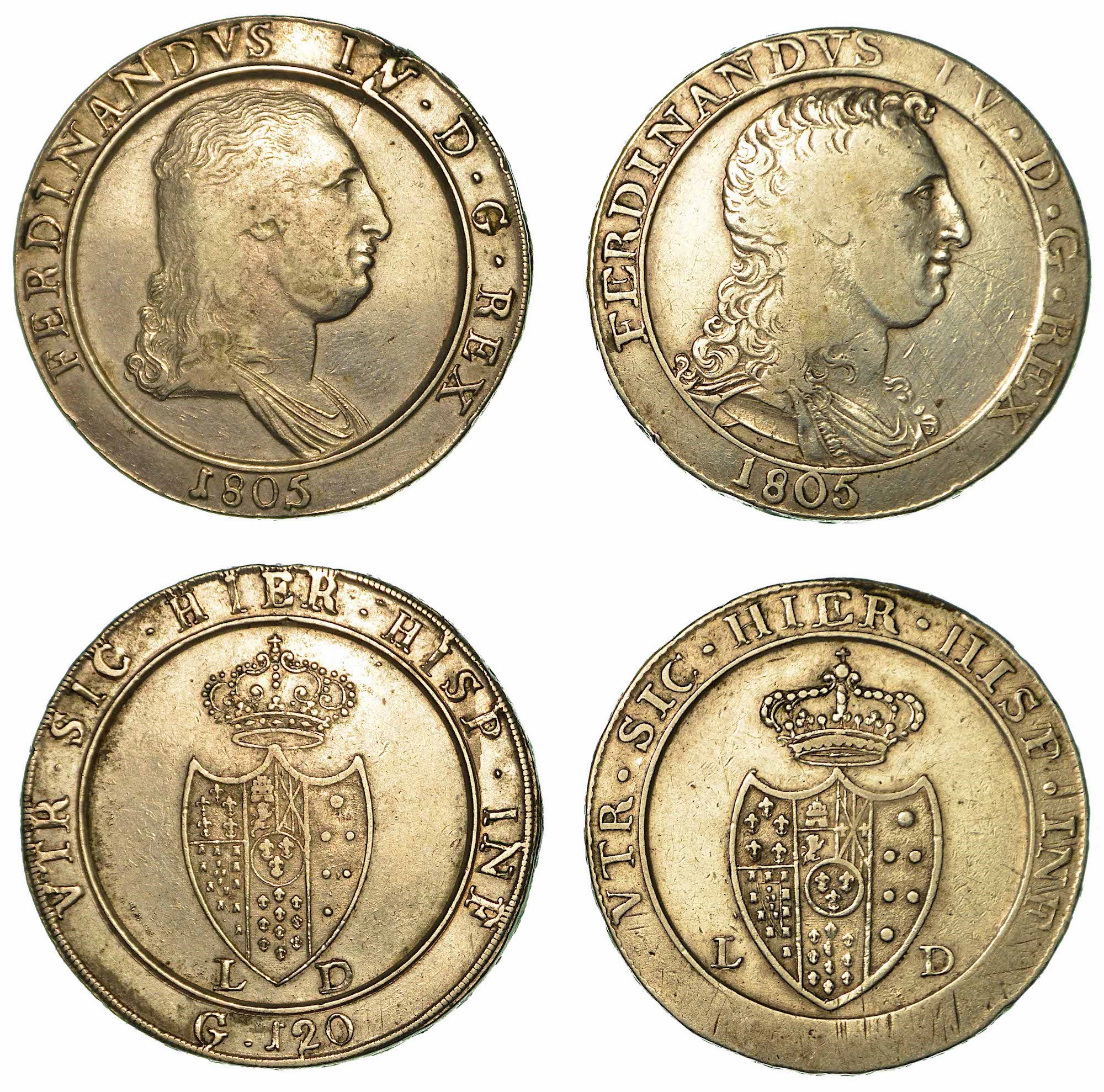 FERDINANDO IV DI BORBONE, 1759-1816. Piastra da 120 Grana 1805 (tipo capelli lisci, stemma piccolo). Busto drappeggiato a d., con capelli lisci. R/ Stemma coronato. Pannuti-Riccio 11. Gig. 72a. MIR. 424. g. 27.60. Diam. mm. 37,84. Arg. MB/BB - Piastra da 120 Grana 1805 (tipo capelli mossi, stemma piccolo). Busto drappeggiato a d., con capelli fluenti. R/ Stemma coronato. Pannuti-Riccio 9. Gig. 71b. MIR. 423. g. 27.33. Diam. mm. 37,11. Arg. MB/BB (Lucidata).