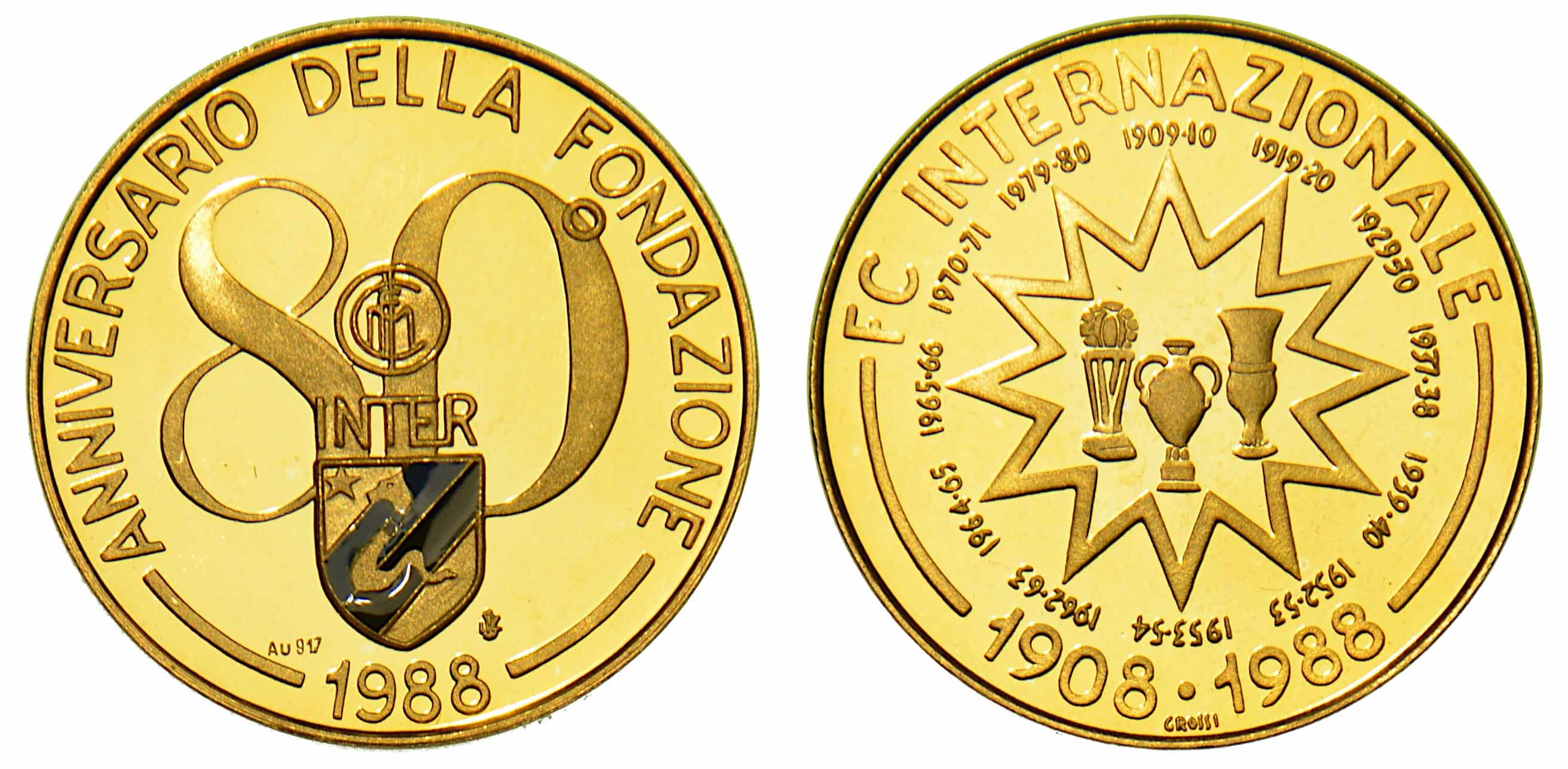 OTTANTESIMO ANNIVERSARIO DELLA FONDAZIONE DELL'INTER (1908-1988). Medaglia ufficiale in oro 1988.