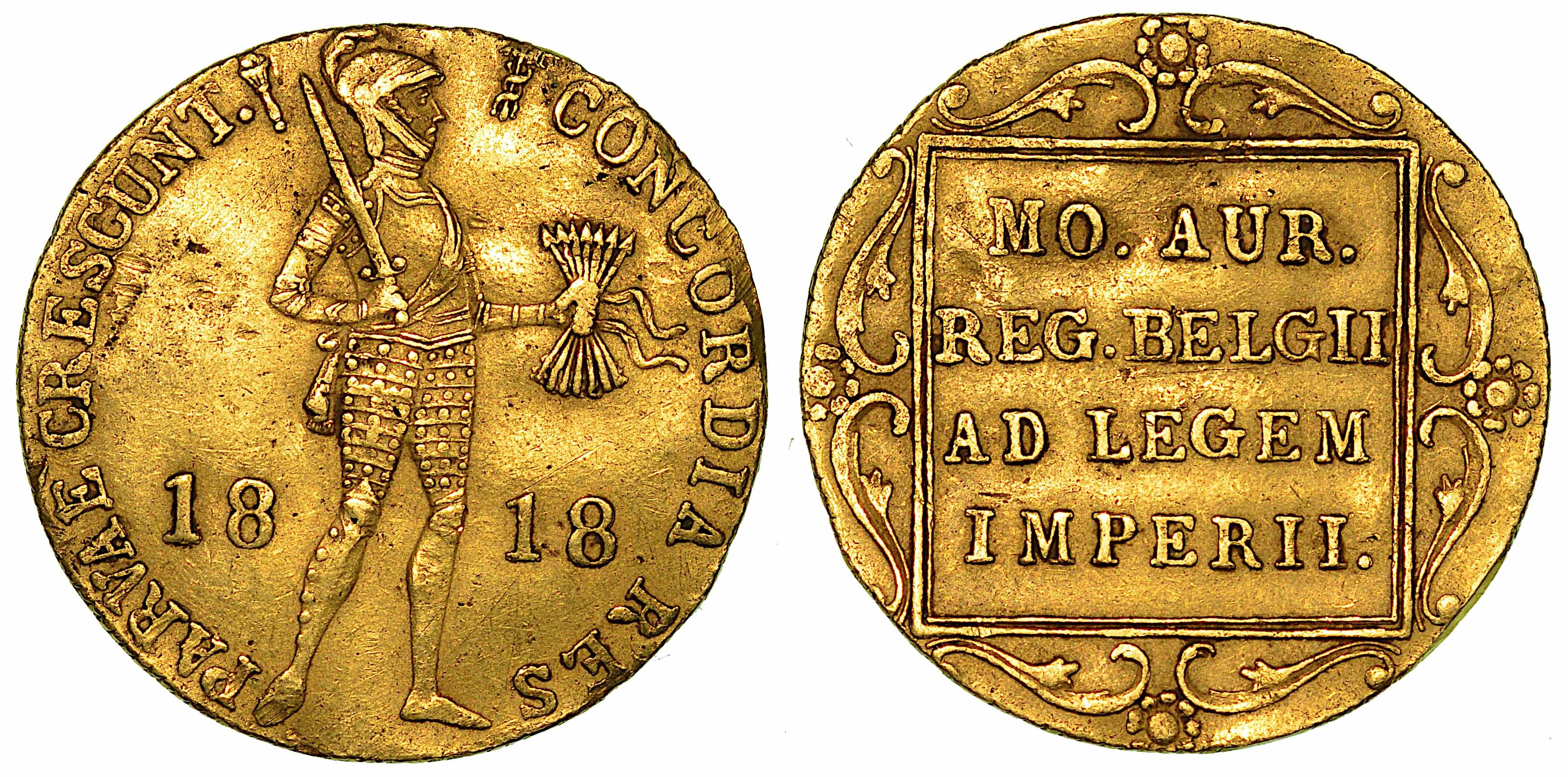 Cavaliere stante a d. con spada sulla spalla e con in mano un fascio di frecce. R/ MO• AUR• REG• BELGII AD LEGEM IMPERII• in quattro righe entro cartiglio ornato. Friedb. 331. Schulmann 205. g. 3,41. Diam. mm. 20,16. Oro. q.BB