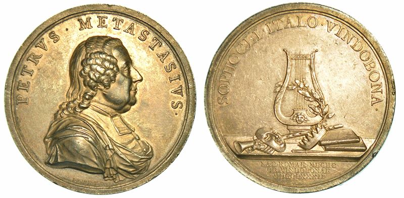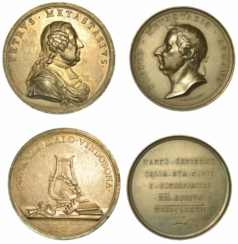 Medaglia in argento 1782. Morte a Vienna del poeta e compositore italiano Pietro Trapassi, detto il Metastasio. Busto a d. R/ Una lira circondata da una maschera, una corona, un pugnale, due libri e una tromba. Opus Wirt. Sg. Horsky 7471. g. 26,16. Diam. mm. 41,83. BB/SPL (qualche piccolo segno di contatto) - Medaglia in bronzo 1882. Per il centenario della morte. Testa laureata a s. R/ Legenda e data in cinque righe. Opus C. Moscetti. g. 24,54. Diam. mm. 36,19. BB/SPL