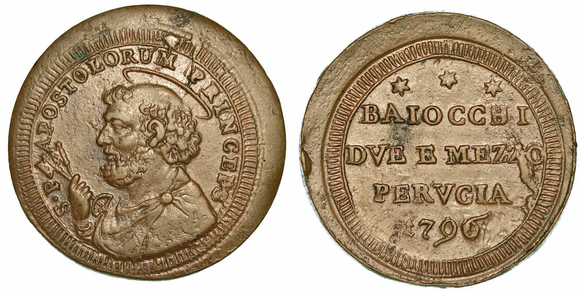 Busto dell'Apostolo Pietro a s. R/ BAIOCCHI / DVE E MEZZO / PERVGIA / 1796. Iscrizione disposta su quattro righe. CNI 6. Munt. 392. Raro. g. 17,38. Diam. mm. 34,54. Rame. Esemplare di grande modulo. q.SPL