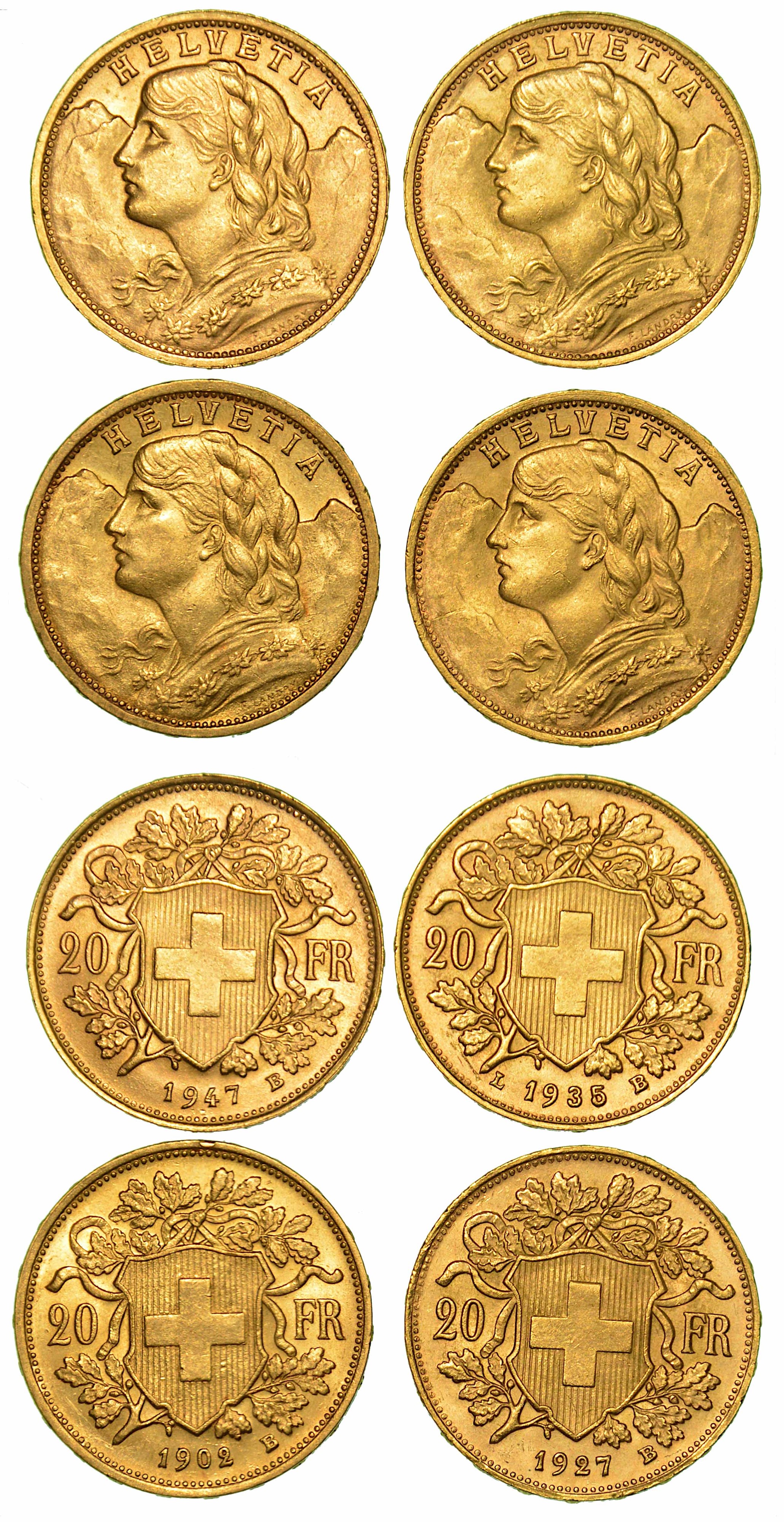 Confederazione. 20 Francs 1902 - 1927 - 1935 - 1948. g. 6,43. Diam. mm. 21,15. Oro. Conservazioni mediamente SPL.