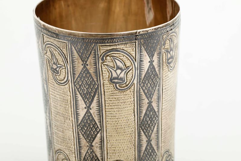 Bicchiere. Argento sbalzato, cesellato, dorato e niellato. Probabili provenienze orientali Russe XIX secolo (apparentemente [..]