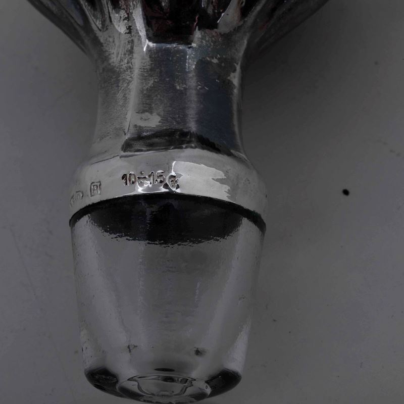 Coppia di bottiglie in cristallo con tappi in argento. Italia XX secolo