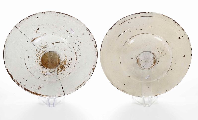 Maiolica. Diametro cm 38 circa. Conservazione: un piatto con felature e minime sbeccature; l'altro ricomposto in restauro