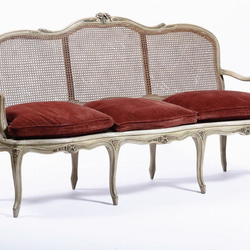 Divano Luigi XV a tre posti in legno intagliato e laccato. XVIII secolo