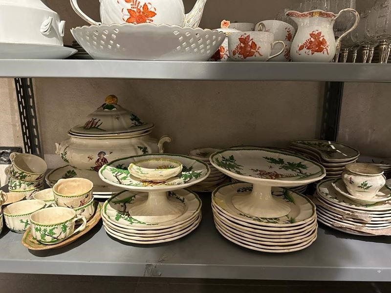 Il servizio è così composto: 12 piatti fondi; 13 piatti piani; 8 piatti da dessert; 8 mezzelune; 1 zuppiera; 2 alzatine; 2 piatti da portata ovali; 1 salsiera; 1 vassoietto ovale; 3 vassoietti rotondi; 11 tazze da tè con 6 piattini