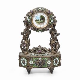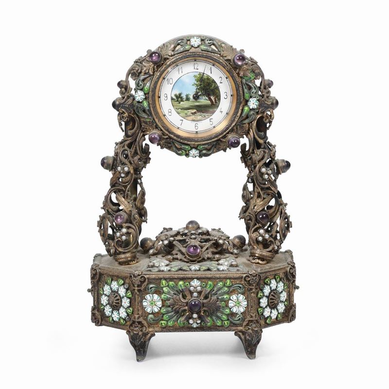 Piccolo orologio da tavolo in metallo dorato e smalti, Boucherer