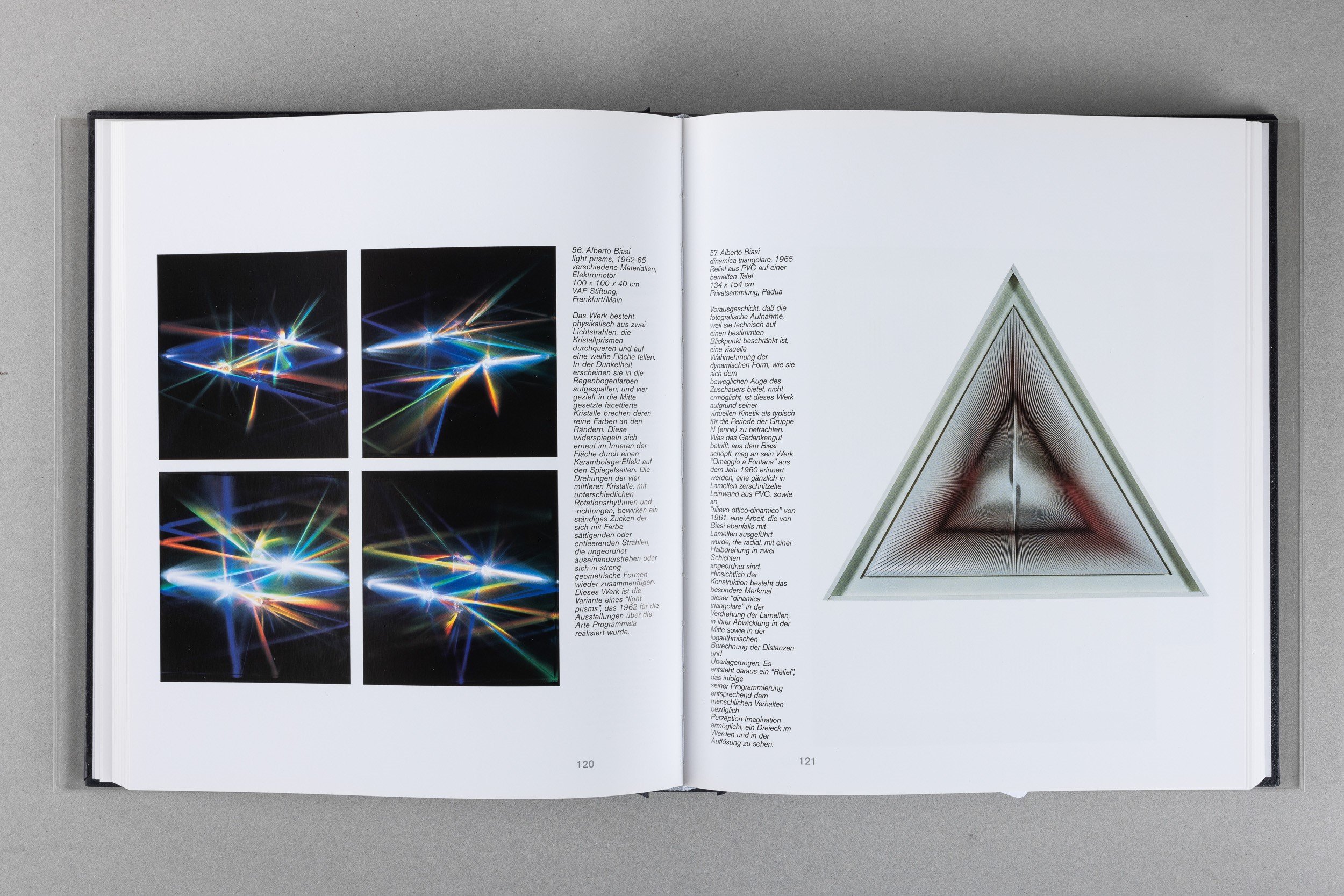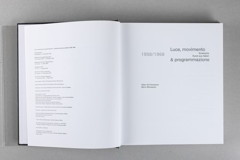 Catalogo a cura di Volker W. Feierabend e Marco Meneguzzo in edizione numerata contenente opera in copertina di Alberto Biasi, es. 17/250 firmato dall'artista, Edizioni Silvana Editoriale, Milano, pp. 304, copertina rigida e sovracoperta in acetato