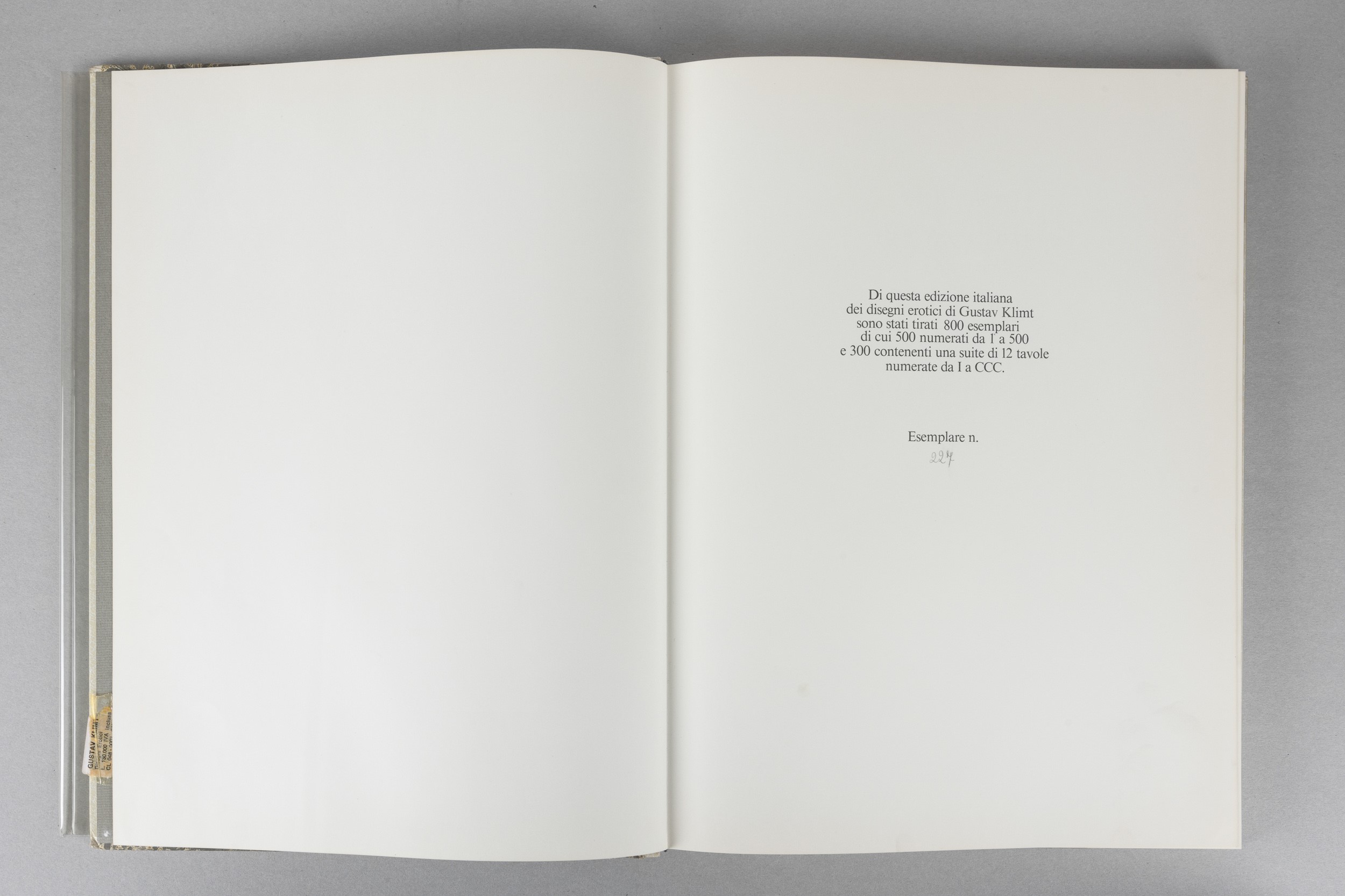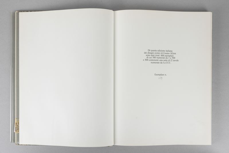 Catalogo a cura di Louisa Seilern con un testo di Hans H. Hofstatter e tavole di Gustav Klimt, edizione tirata in 800 copie, es. n. 227 con legatura in carta marbré, Gabriele Mazzotta Editore, Milano, copertina rigida con sovracoperta in acetato