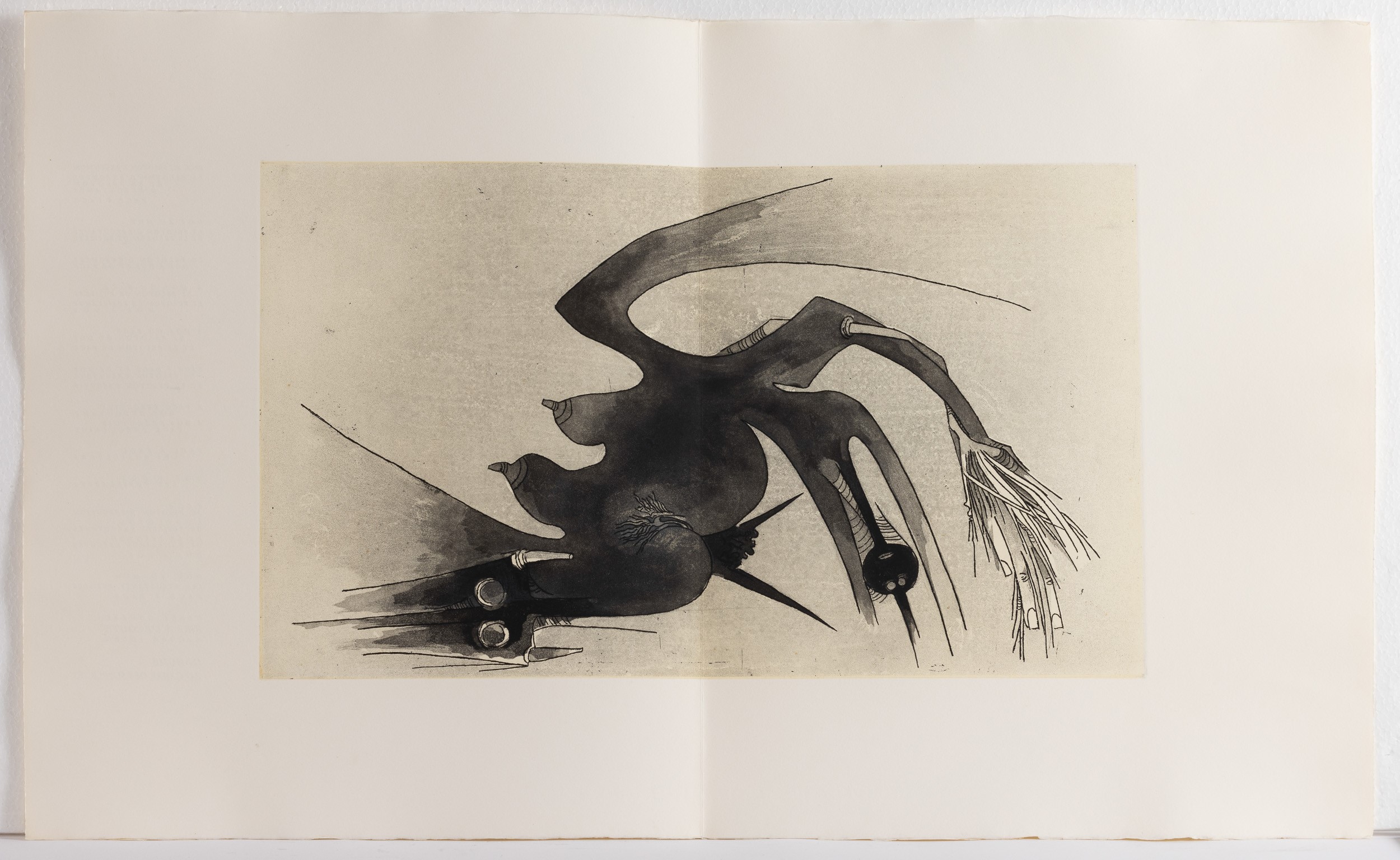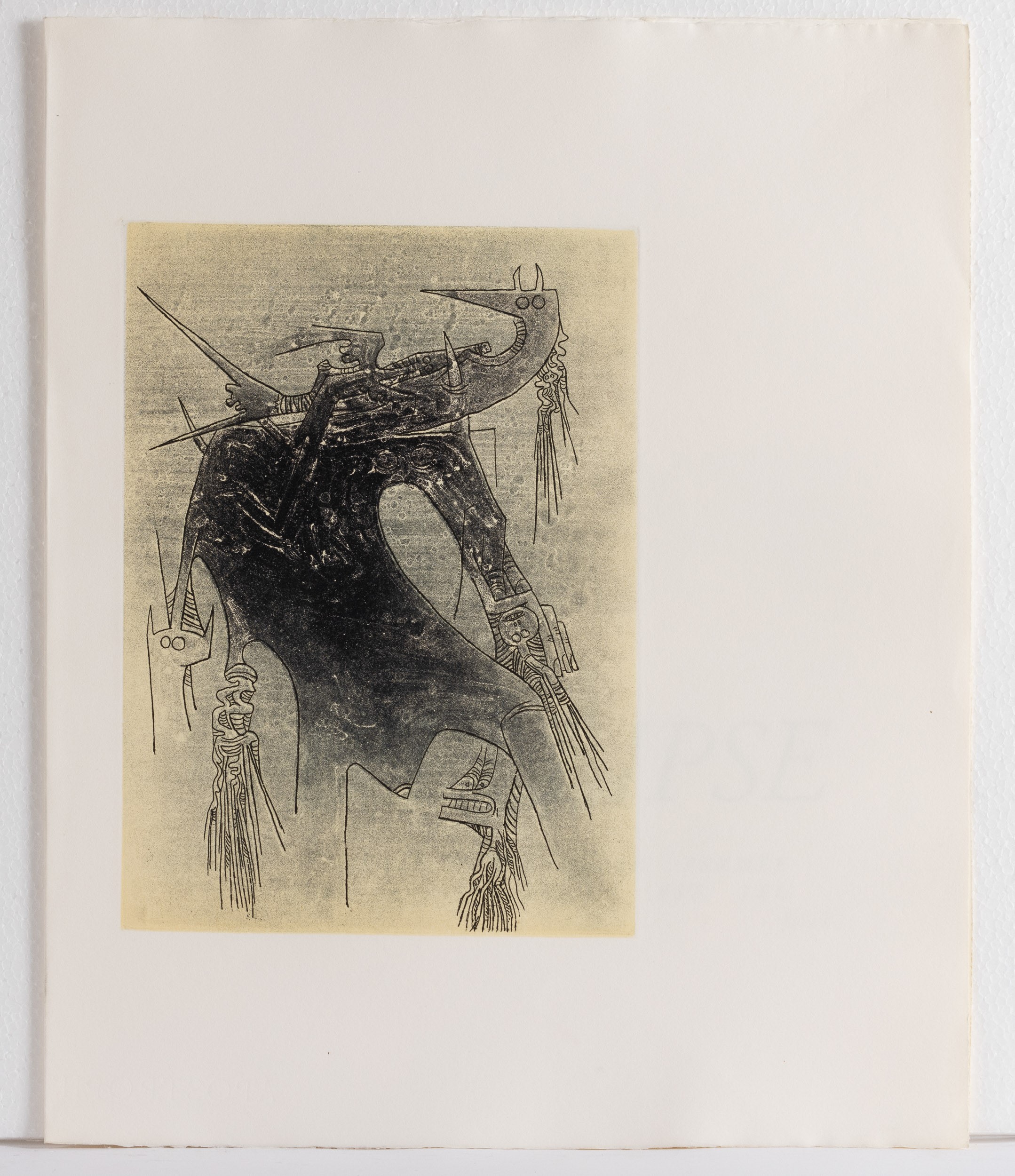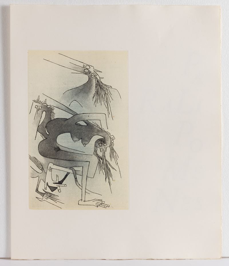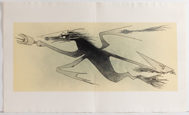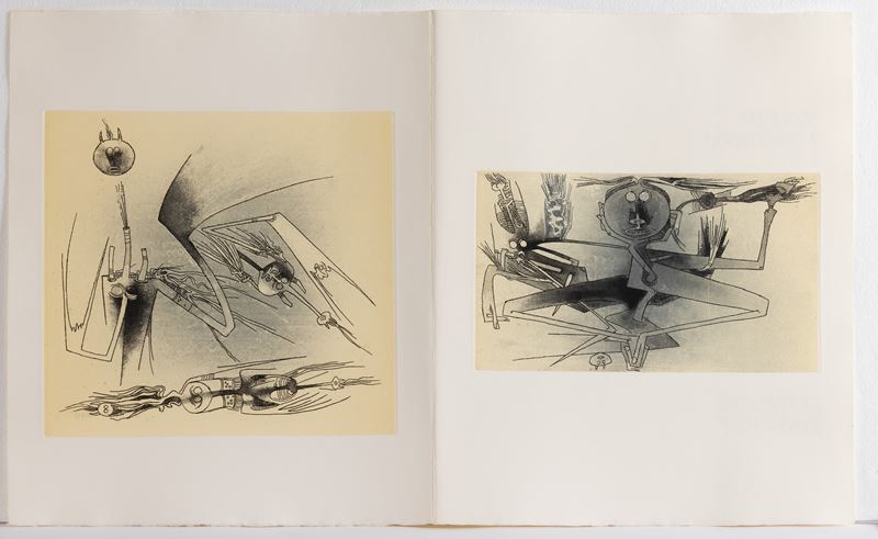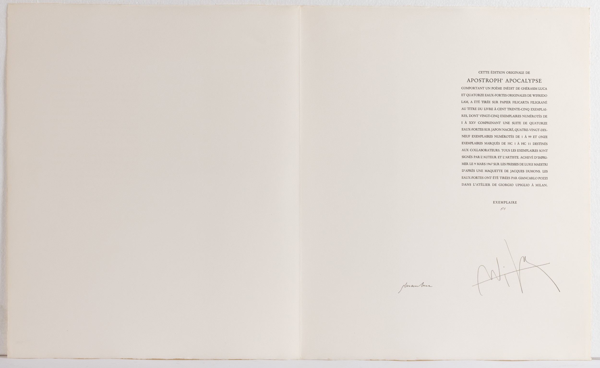 Cartella contenente quattordici acqueforti di Wifredo Lam su carta Filicarta filigrané e il poema di Ghérasim Luca, es. 51/125, firmato dall'autore e dall'artista.