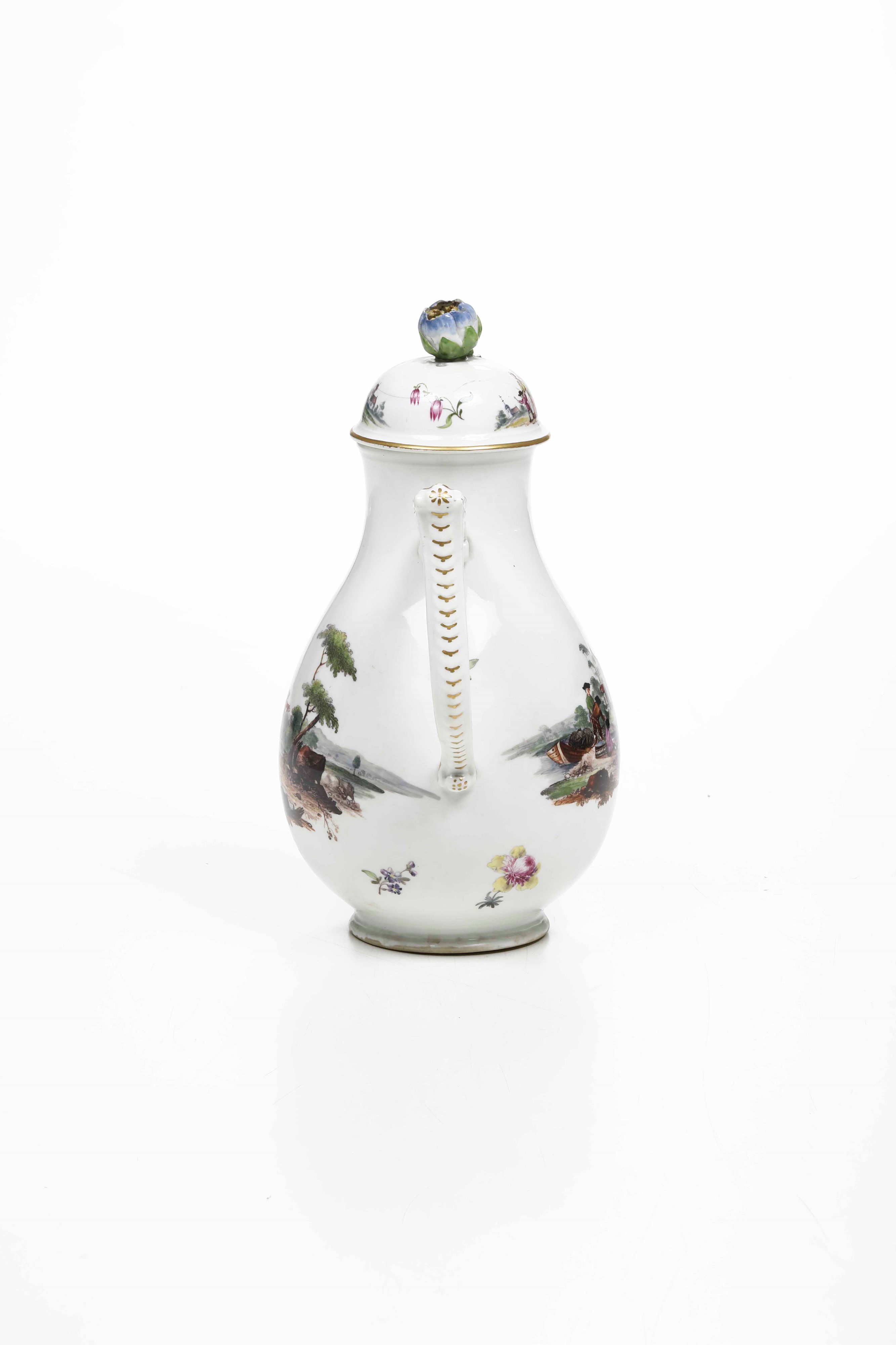 La caffettiera periforme con il coperchio a cupola dalla presa a bocciolo fogliato, ha il manico a “J” ed il beccuccio a rocailles lumeggiati in oro. La decorazione policroma vede, sul recto e sul verso, paesaggi animati con rive ed edifici