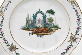 I piatti provengono dal servizio eseguito per la famiglia di Nani Mocenigo dove ogni porcellana è dipinta con un giardino diverso. I nostri sono stati esposti nel 2016 all’importante mostra veneziana tenutasi a Cà Rezzonico, “Geminiano Cozzi e le sue porcellane” (vedi catalogo a cura di M.Ansaldi-A.Craievich, pp. 238-239, nn. 13, 13a)