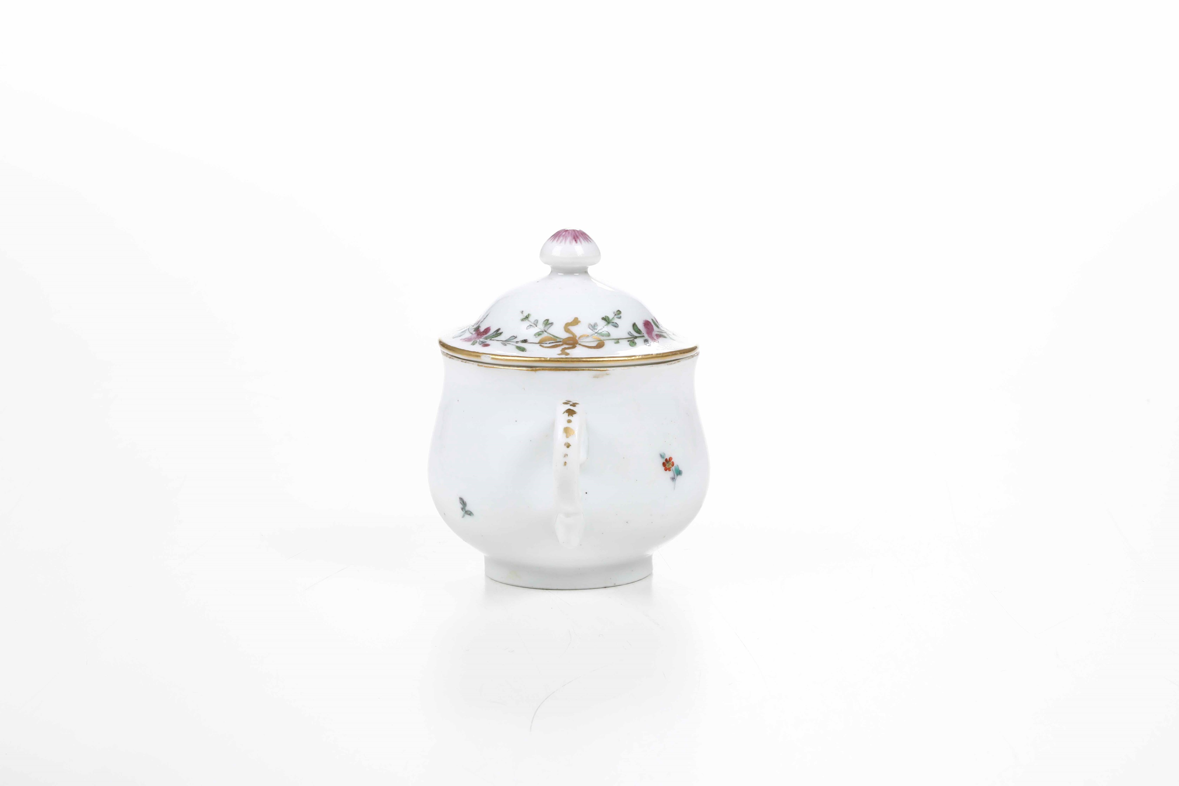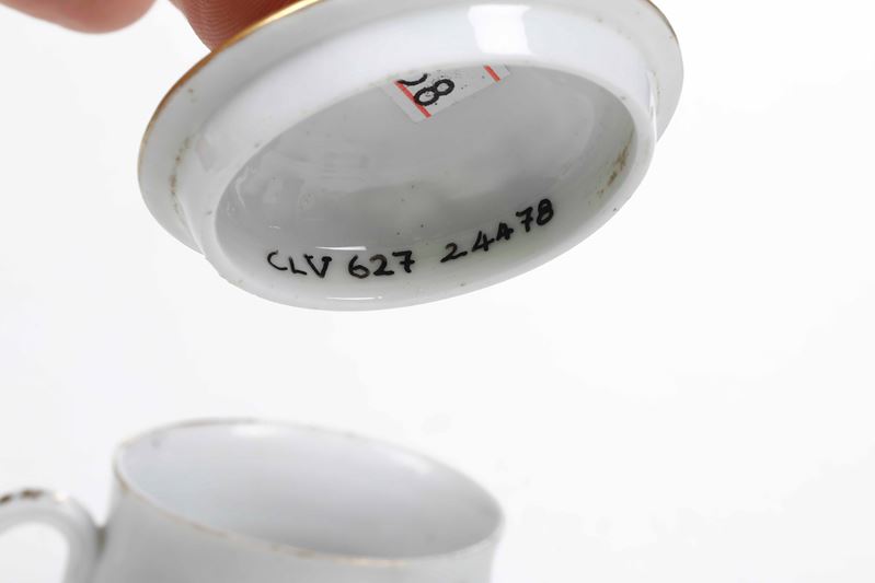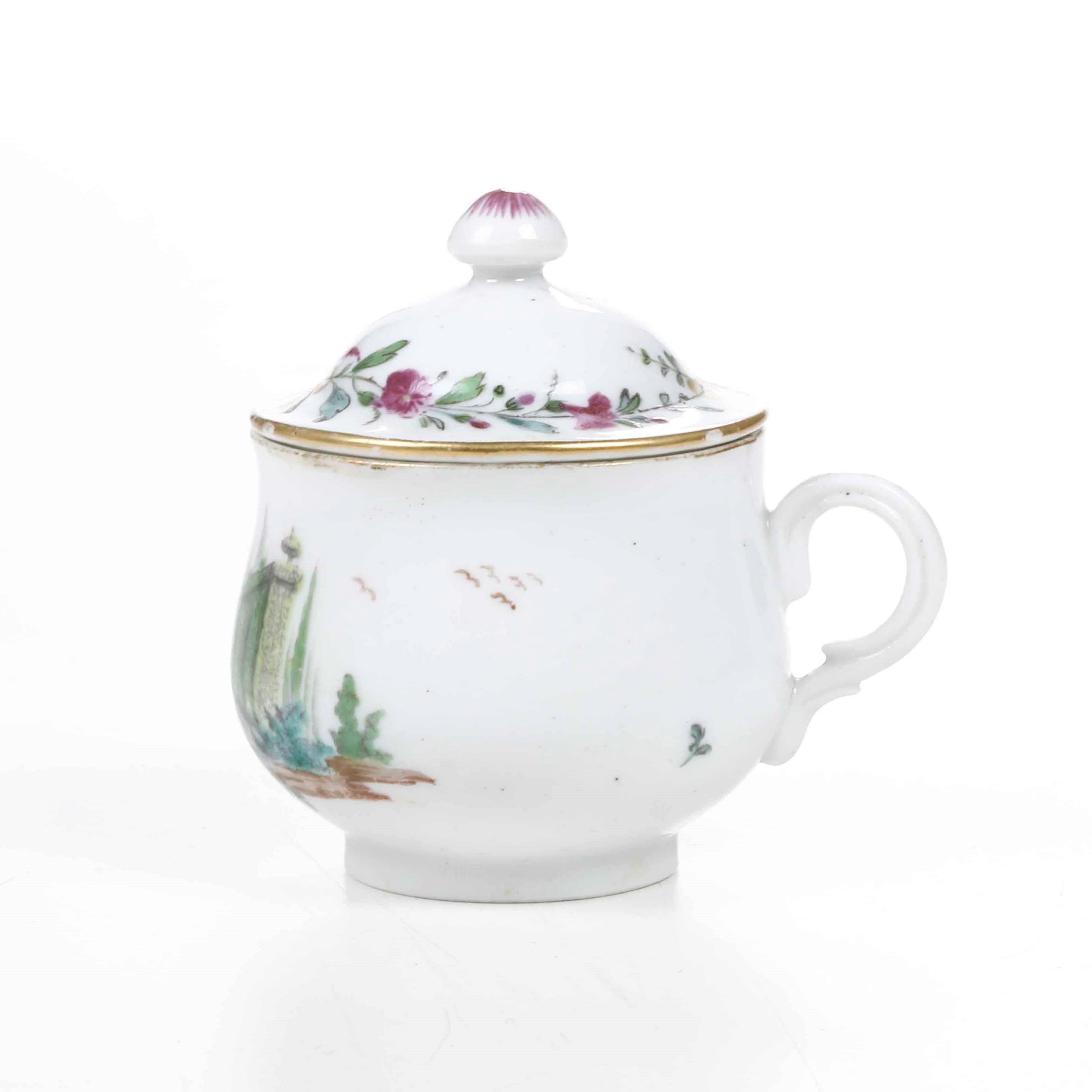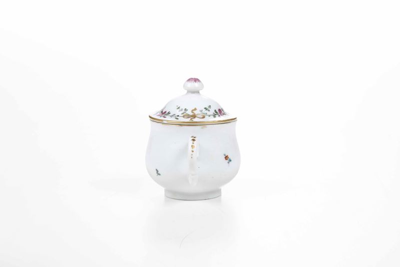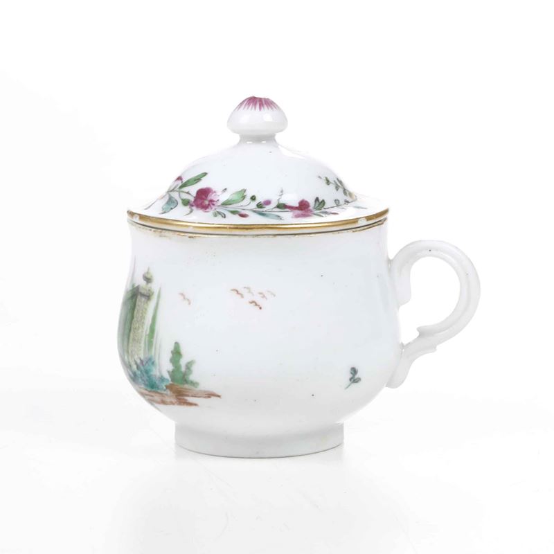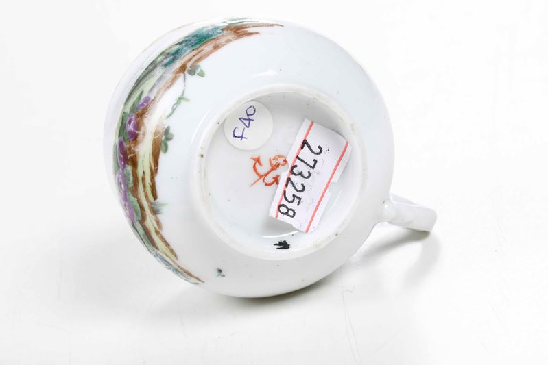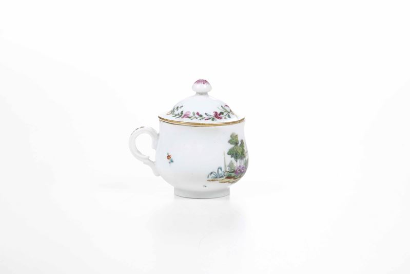 Porcellana. Marca: ancora in rosso. Dimensioni: altezza tazza cm 7. Conservazione: ottima; insignificanti usure d’oro al bordo superiore e insignificante sbeccatura al bordo del coperchio