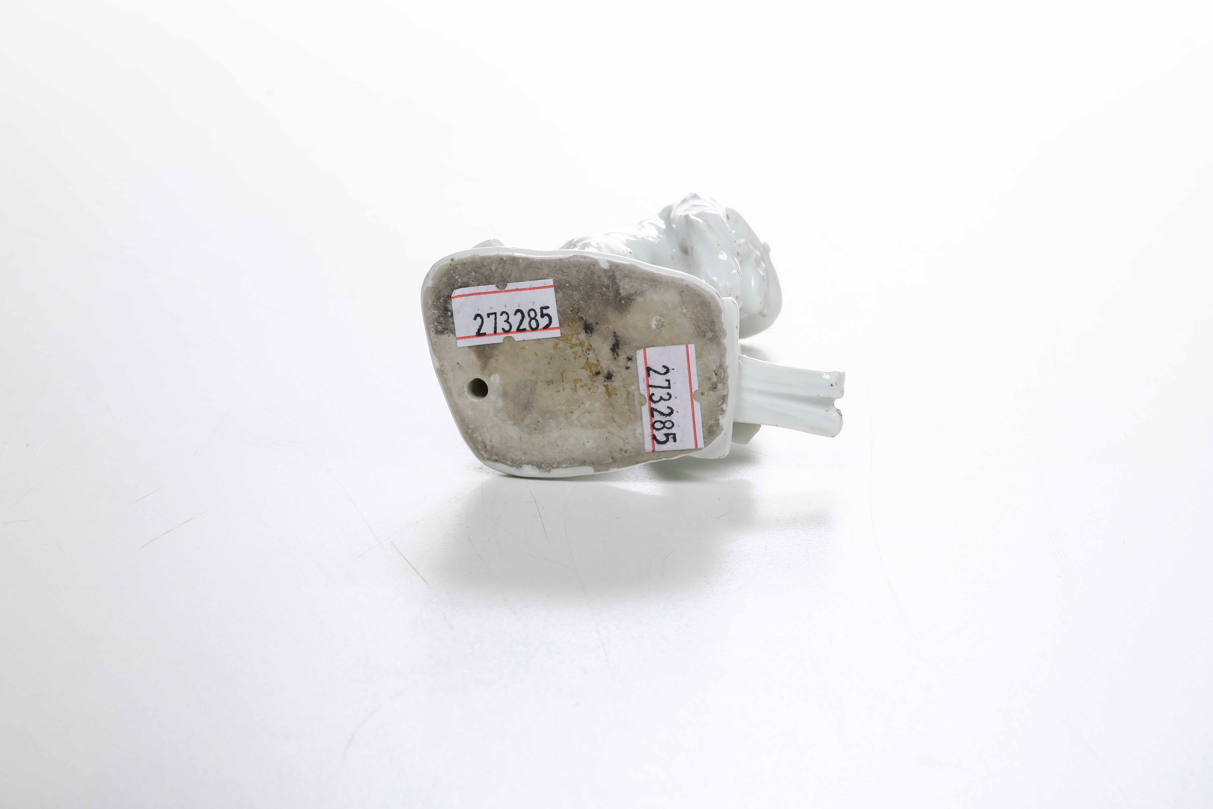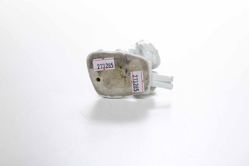 Porcellana bianca. Marca: assente o non visibile sotto lo zoccolo. Altezza cm 13,3. Conservazione: ottima; ascia mancante già prima della cottura