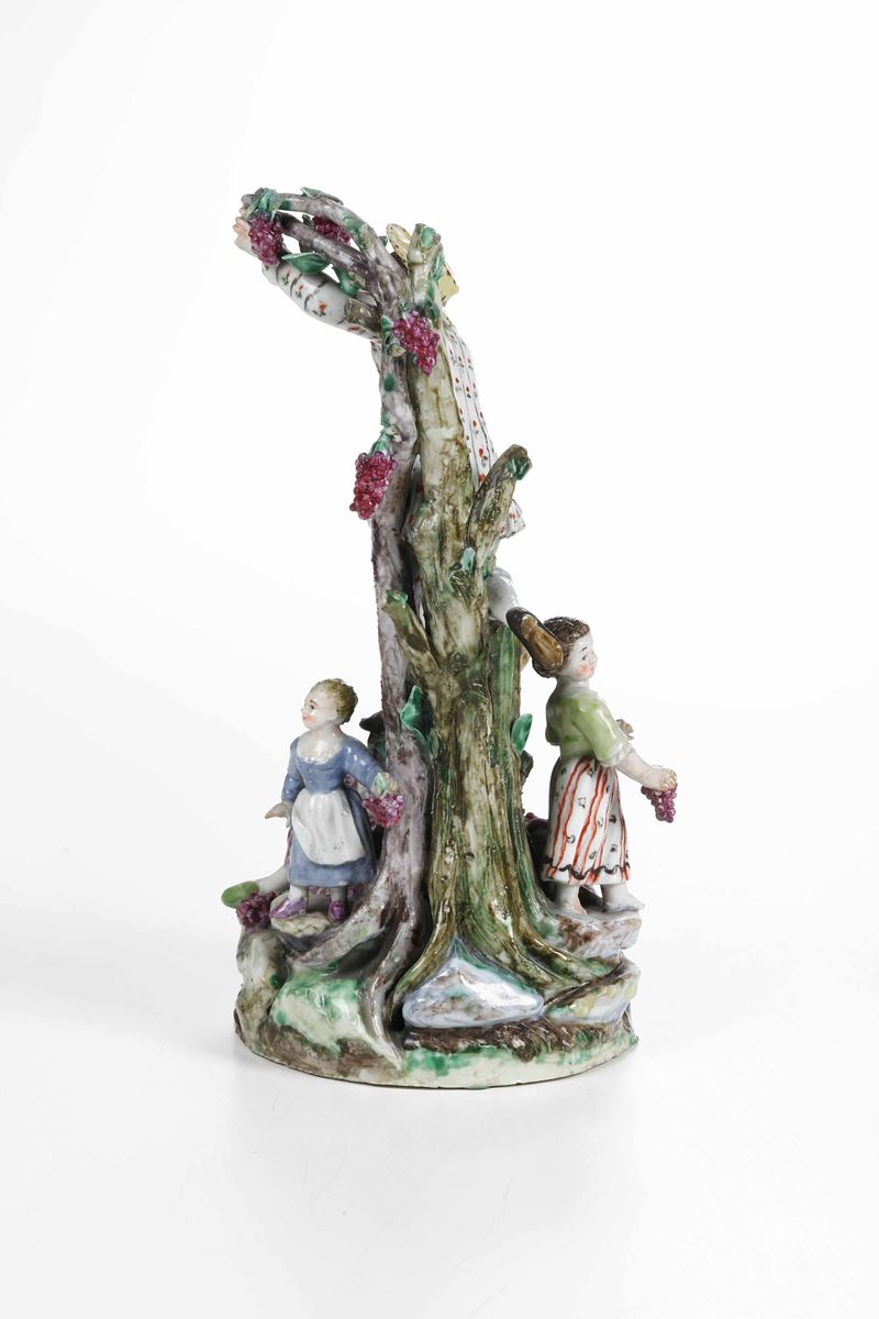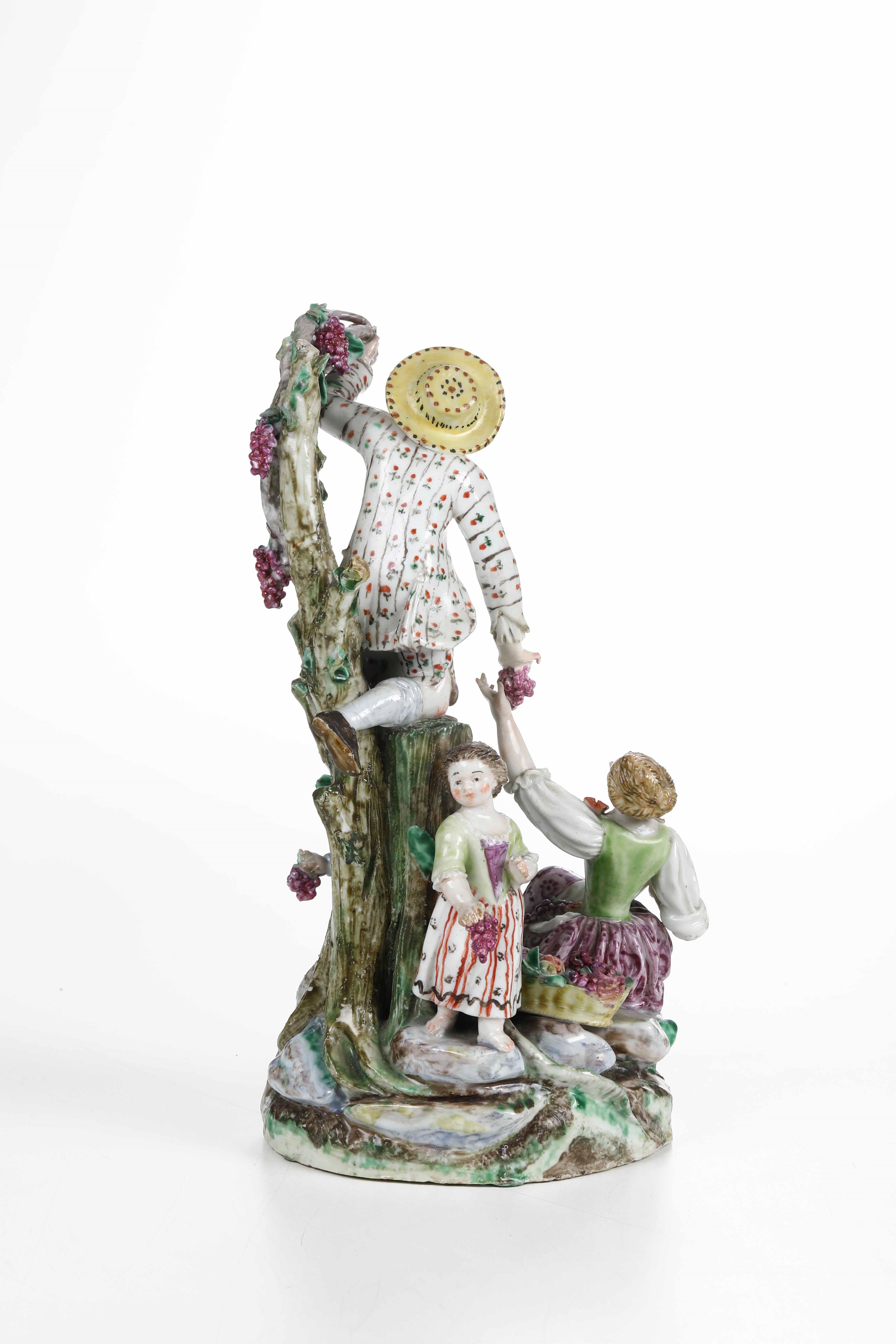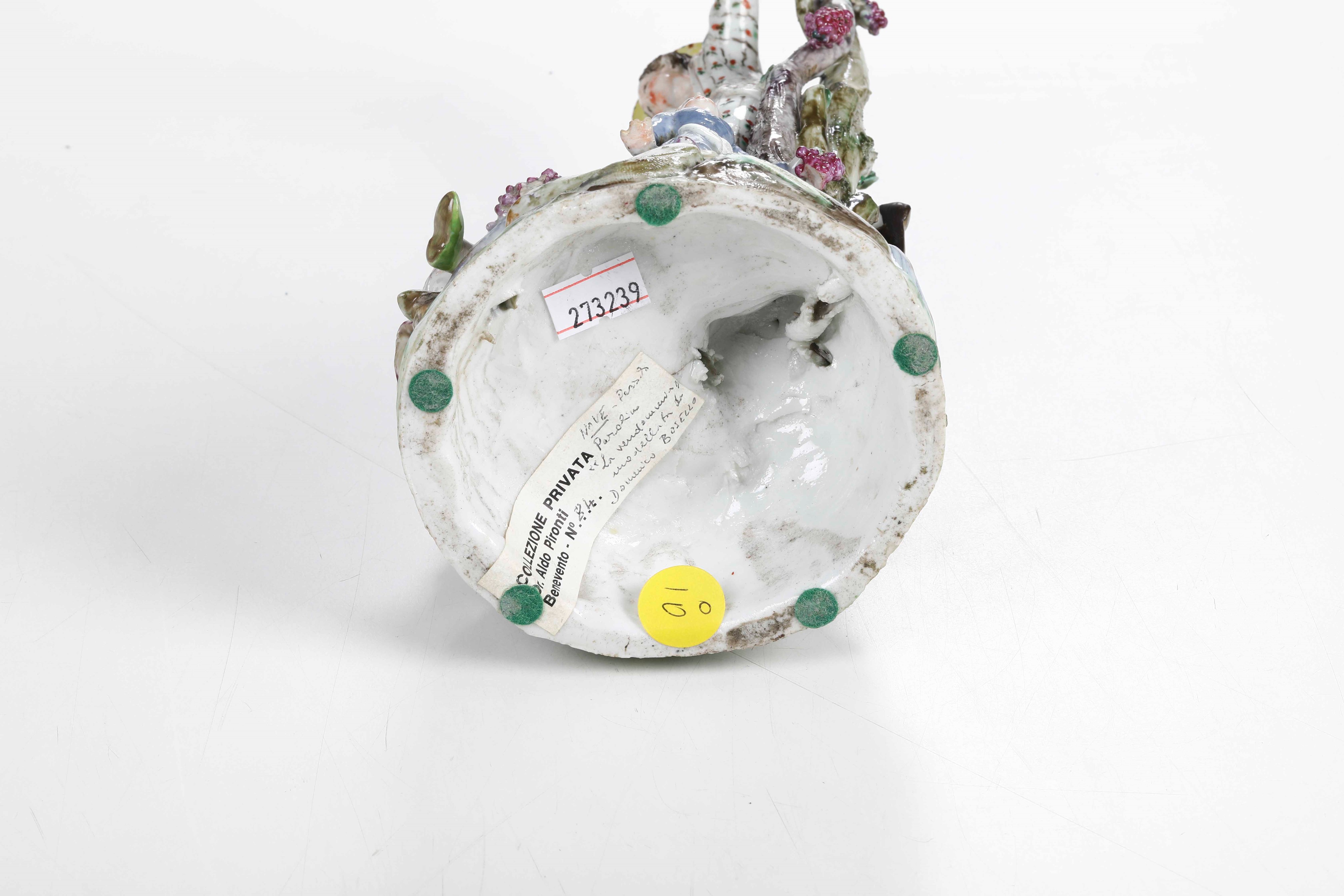 Porcellana. Marca: assente. Altezza cm 22,4. Conservazione: mano destra del vendemmiatore riattaccata; piede sinistro della giovane restaurato; mancanze minori. Provenienza: collezione Dottor A. Pironti, Benevento, come da etichetta cartacea