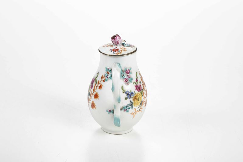 Lattiera dal manico modellato a ramoscello fogliato, coperchio con presa a bocciolo e beccuccio a motivi vegetali in oro. La decorazione vede tre steli monocromi fogliati e fioriti dall’andamento sinuoso e disposti a raggiera da cui fuoriescono altrettanti mazzolini policromi