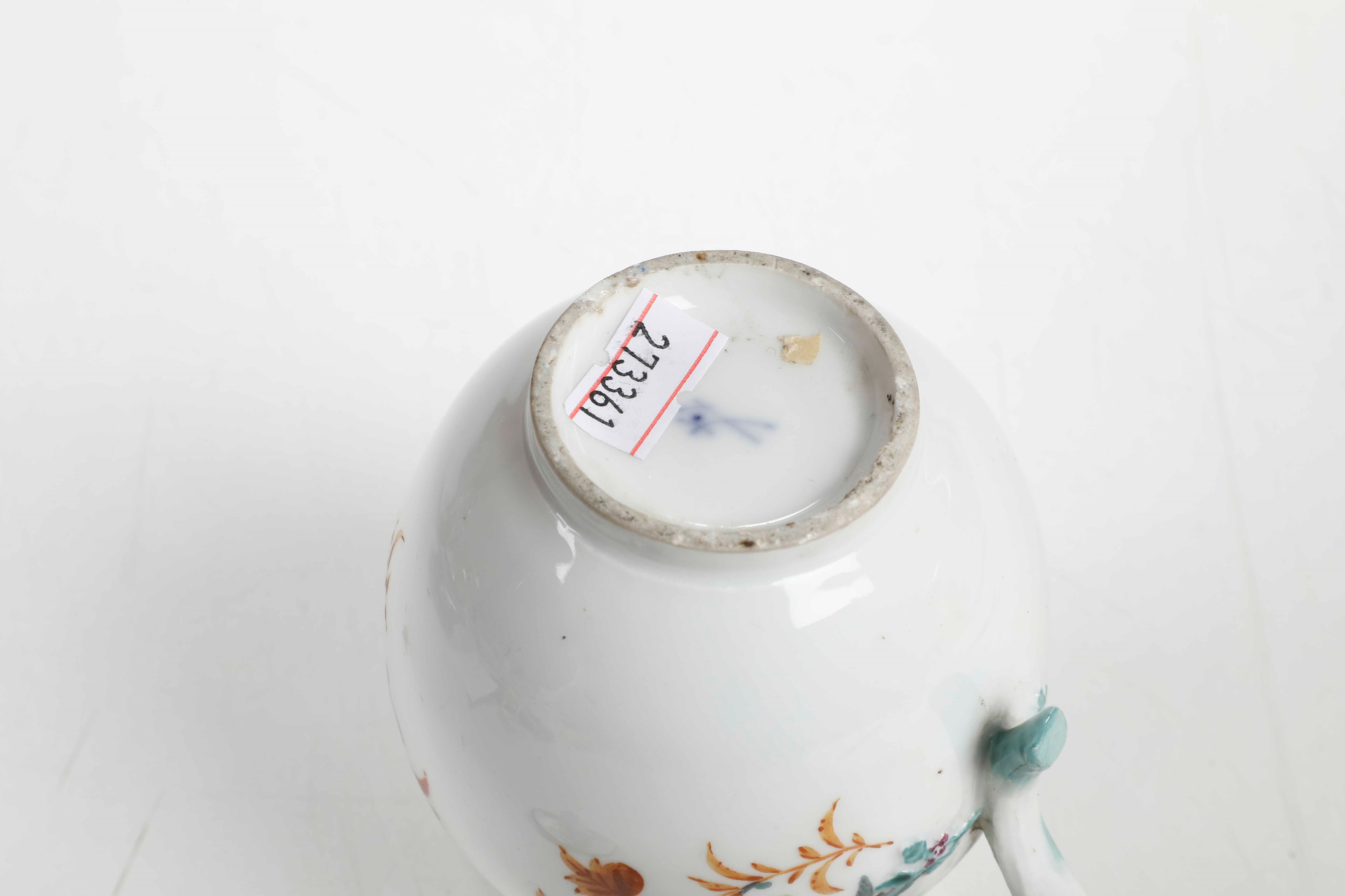 Porcellana. Marca: spade incrociate con puntino tra le else, in blu. Altezza cm 13,2. Conservazione: vecchi restauri al beccuccio e al coperchio