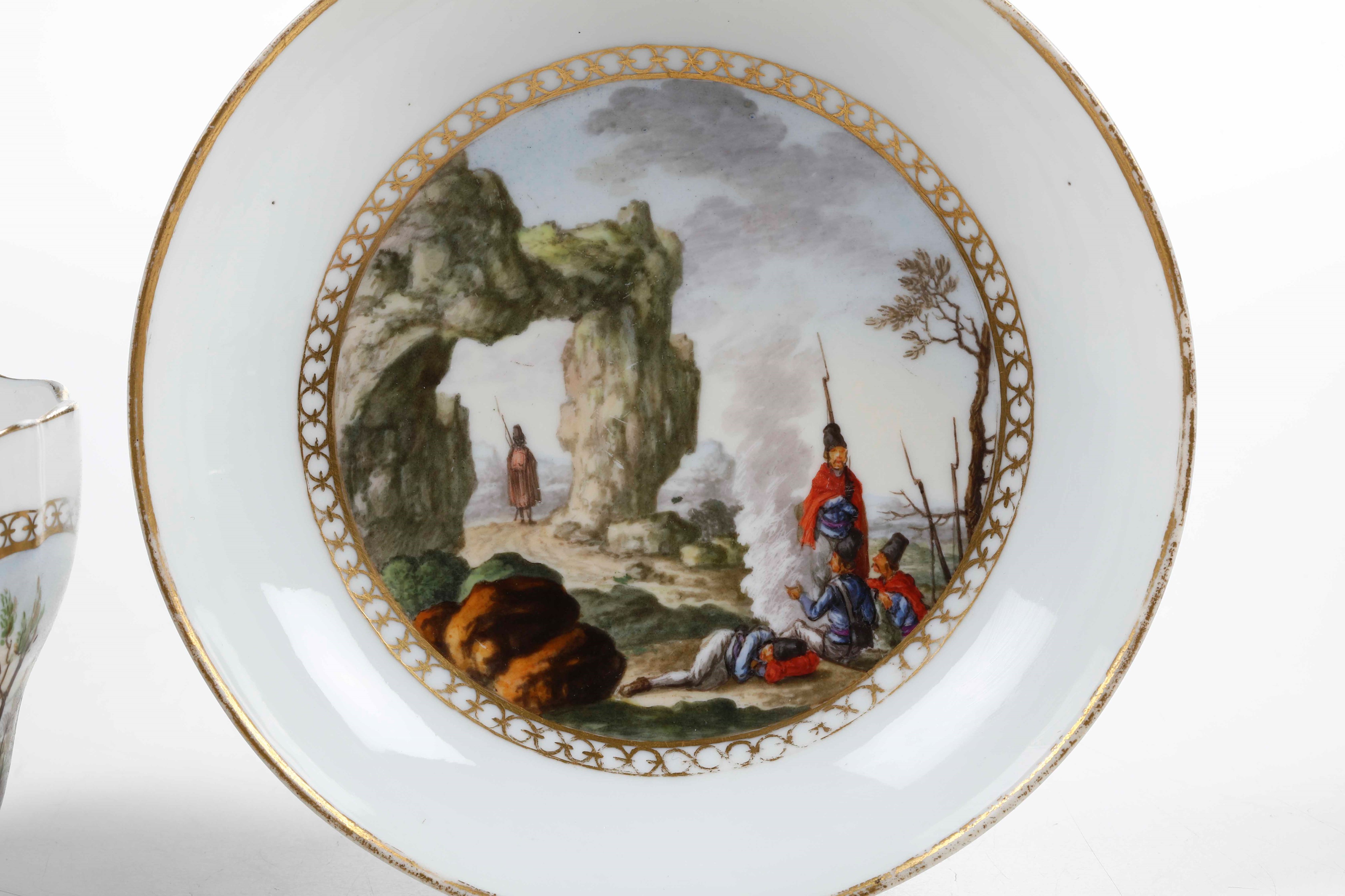 La tazza dal bordo mistilineo e la parete mossa che si allarga verso l’alto, ha il manico modellato con due tralci fogliati che si incrociano. La decorazione policroma vede, sia sulla tazza che sul piattino, una riserva incorniciata da una catenella a cerchietti in oro che racchiude scene con soldati al bivacco e rovine