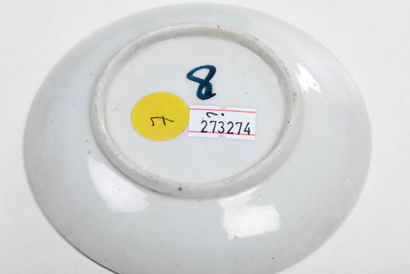 Per tazze e piattini decorati con questa tipologia vedi ad esempio: A.D’Agliano, Porcellane italiane dalla collezione Lokar, Milano 2013, p. 119, n. 59; e quelli attribuiti erroneamente sino a pochi anni fa alla fabbrica vicentina Vicentini dal Giglio, pubblicati da G.Morazzoni-S.Levy, Le porcellane italiane, Milano 1960, I, tav. 150; S.Levy, Tazzine italiane da collezione, Milano 1968, tavv. 31-33
