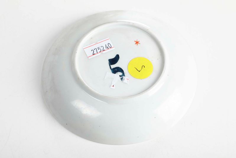Porcellana. Marca: stella in rosso. Diametro cm 11,7. Conservazione: usure alla policromia