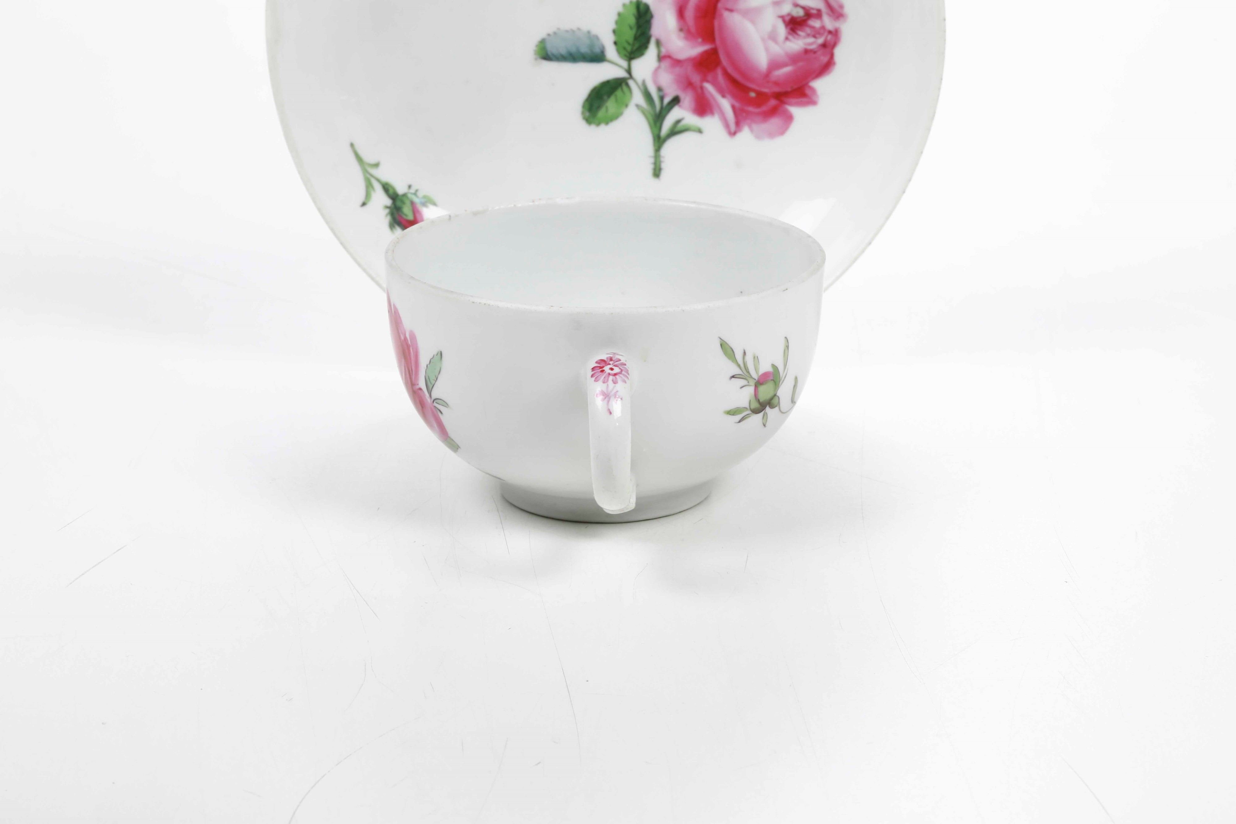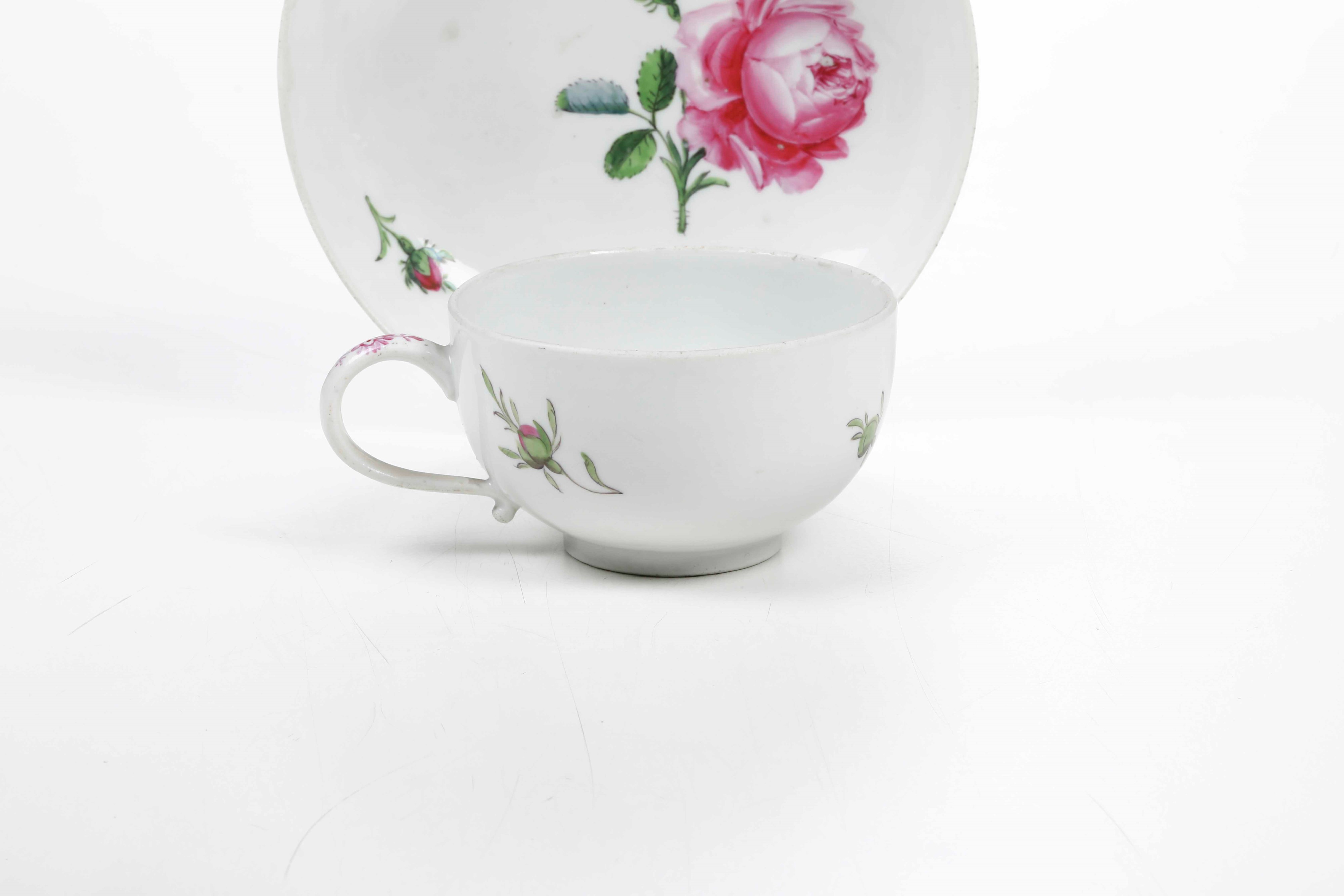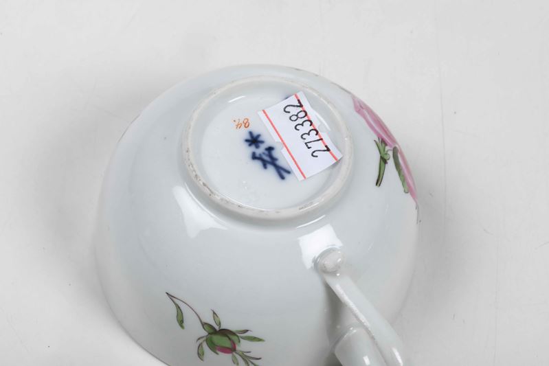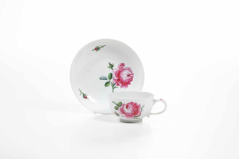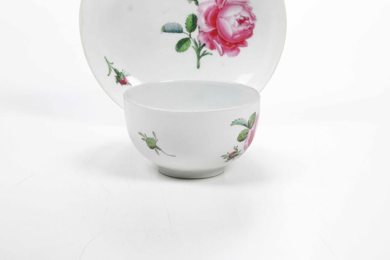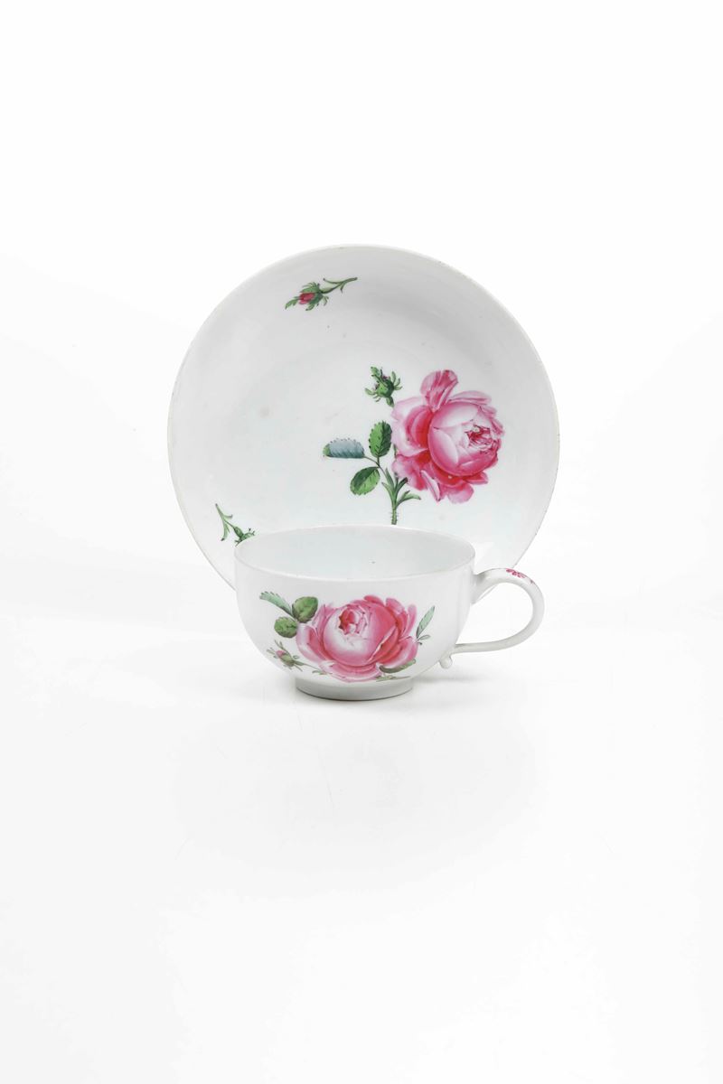 La tazza da manico ad orecchio e il piattino dal bordo liscio sono dipinti in policromia con uno stelo fogliato con una rosa e boccioli sparsi