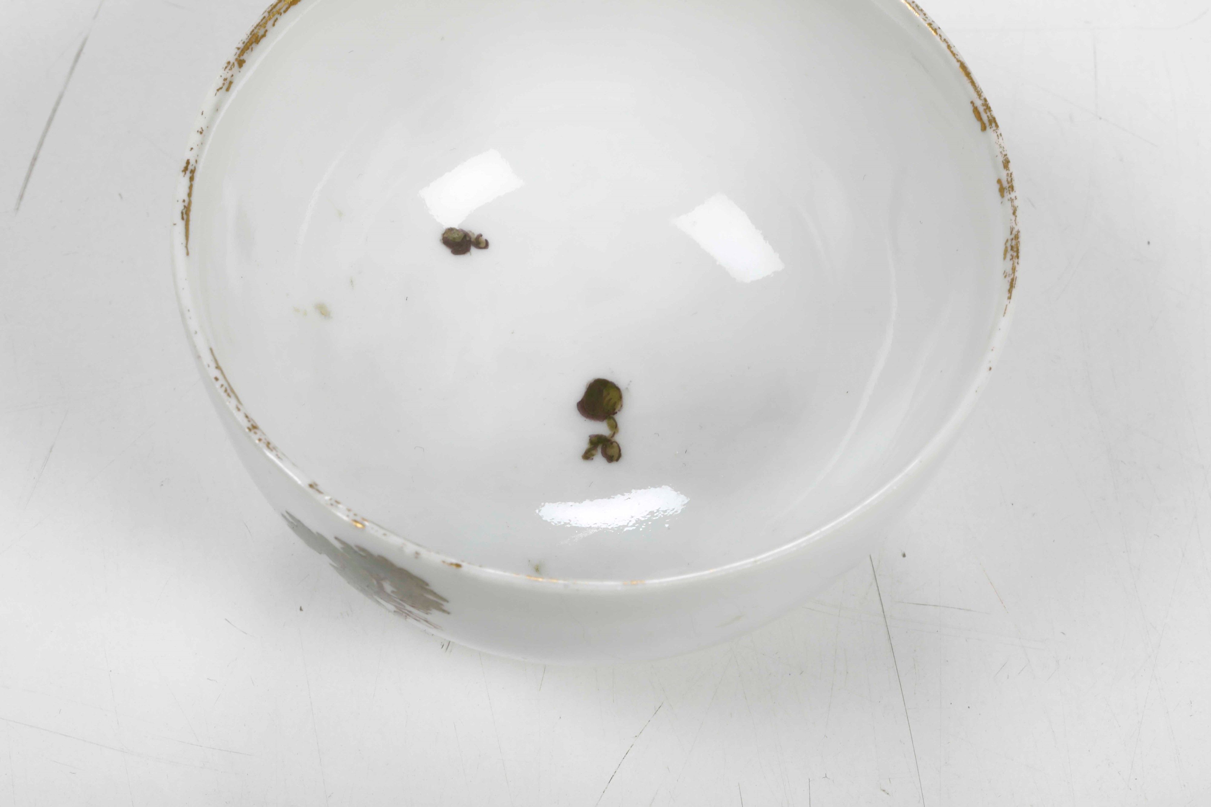 Porcellana. Marca: "Z" con due puntini alla base, in blu. Dimensioni: altezza tazza cm 4,5; diametro piattino cm 13. Conservazione: buona, usure all’oro