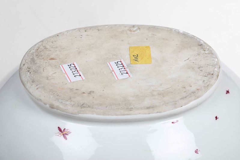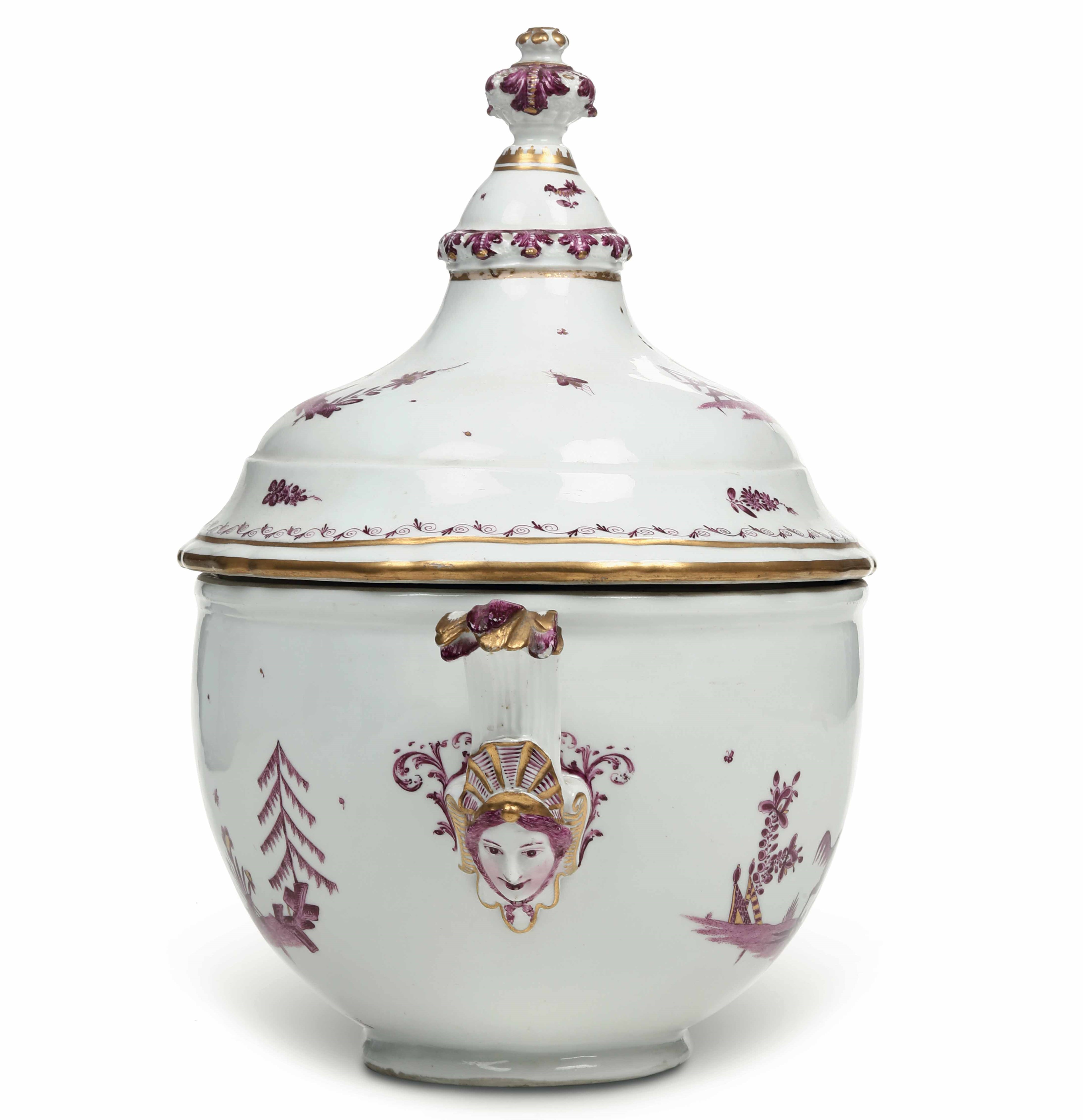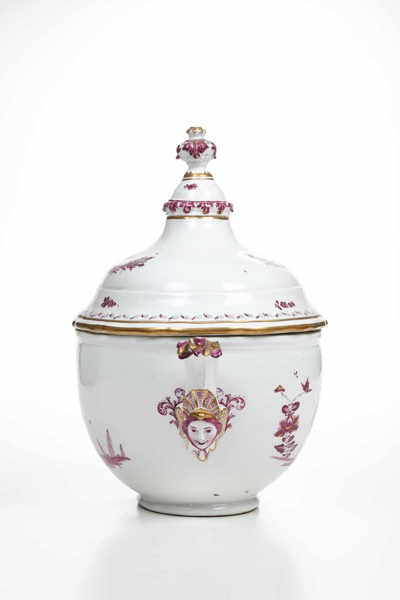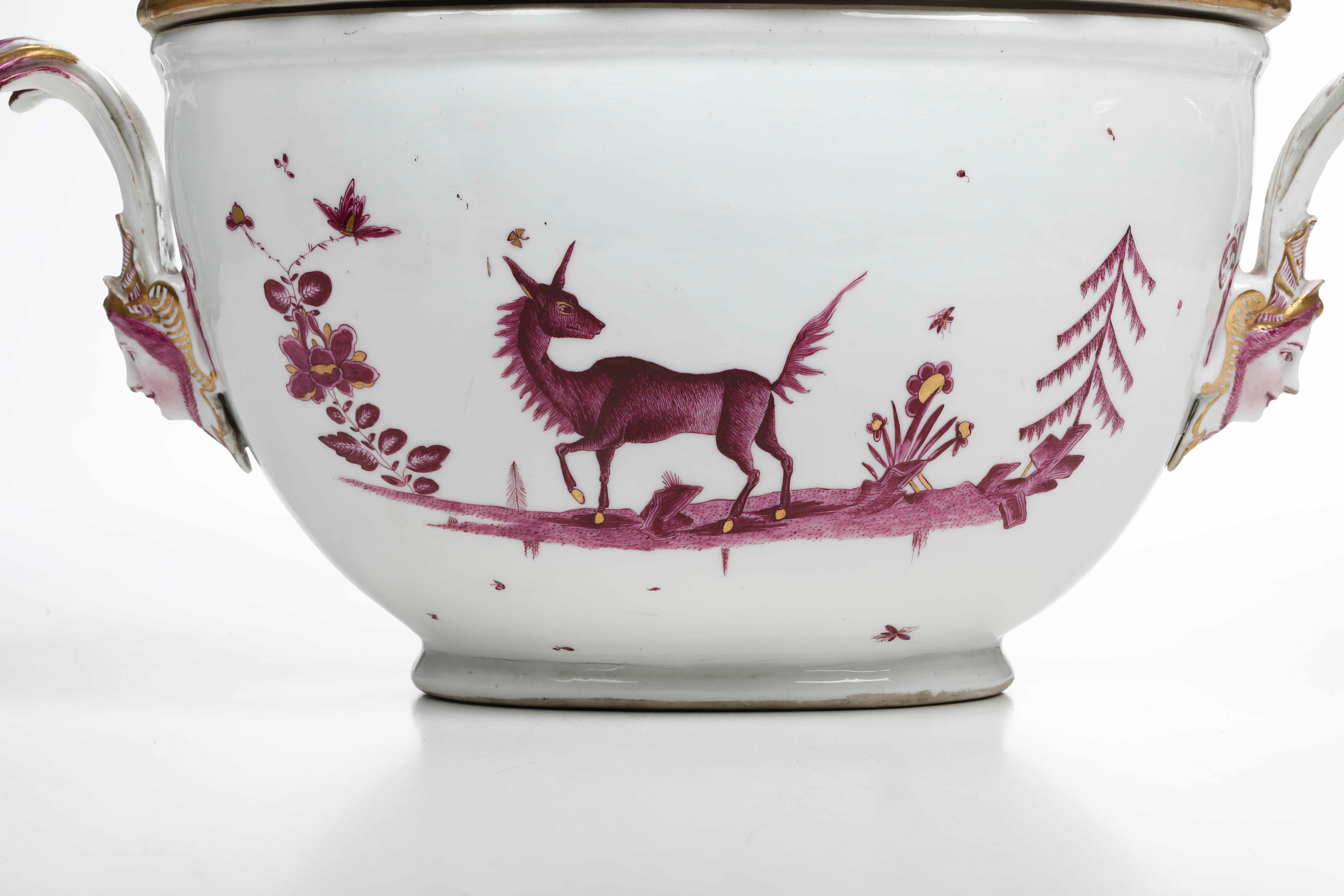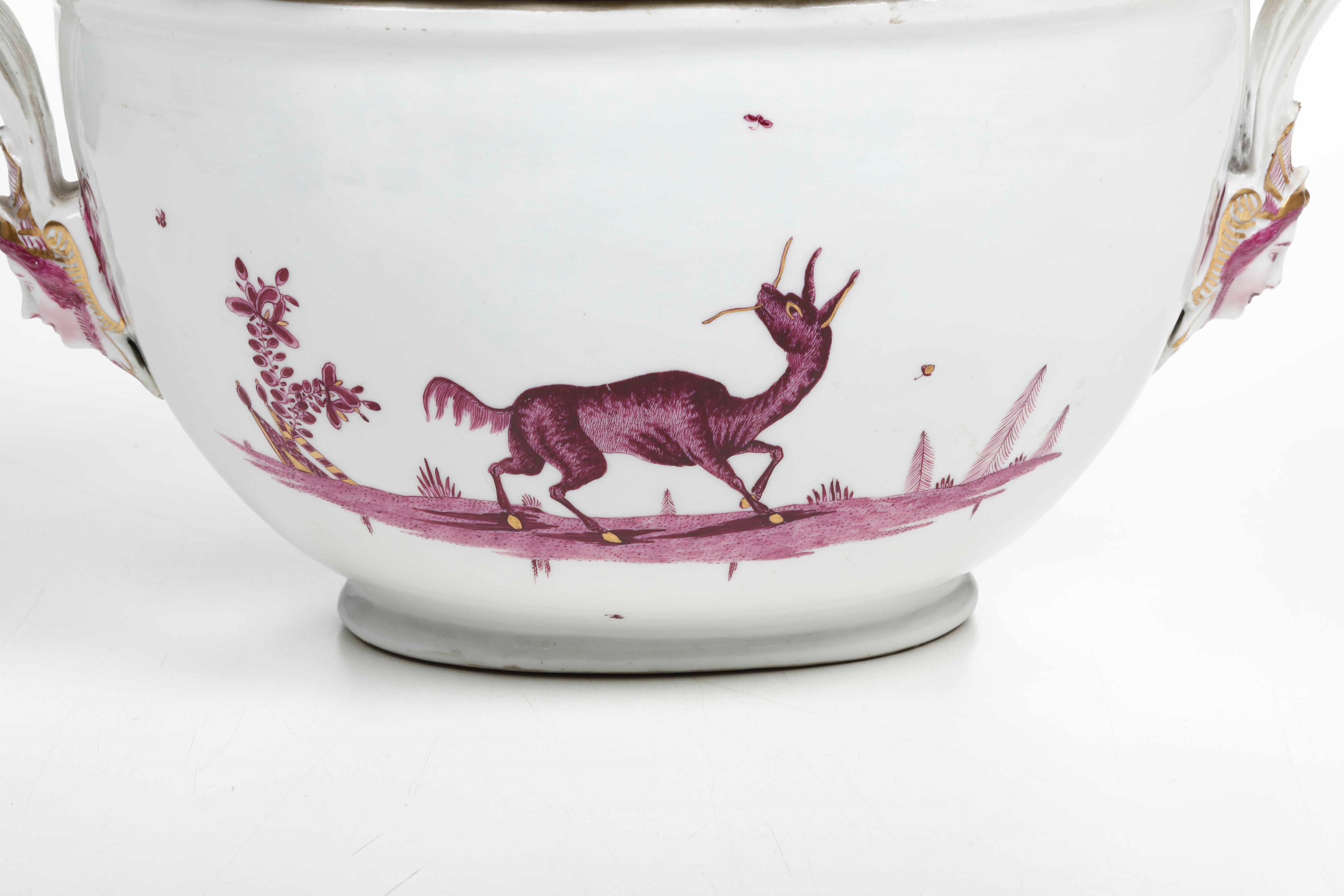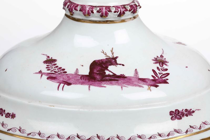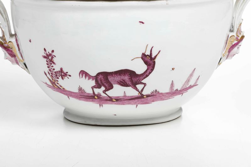 Porcellana decorata in monocromia porpora ed oro con animali fantastici. Marca: spade incrociate in blu. Altezza cm 32; cm 35,8x22. Conservazione: insignificanti sbeccature ai manici e insignificanti usure all'oro