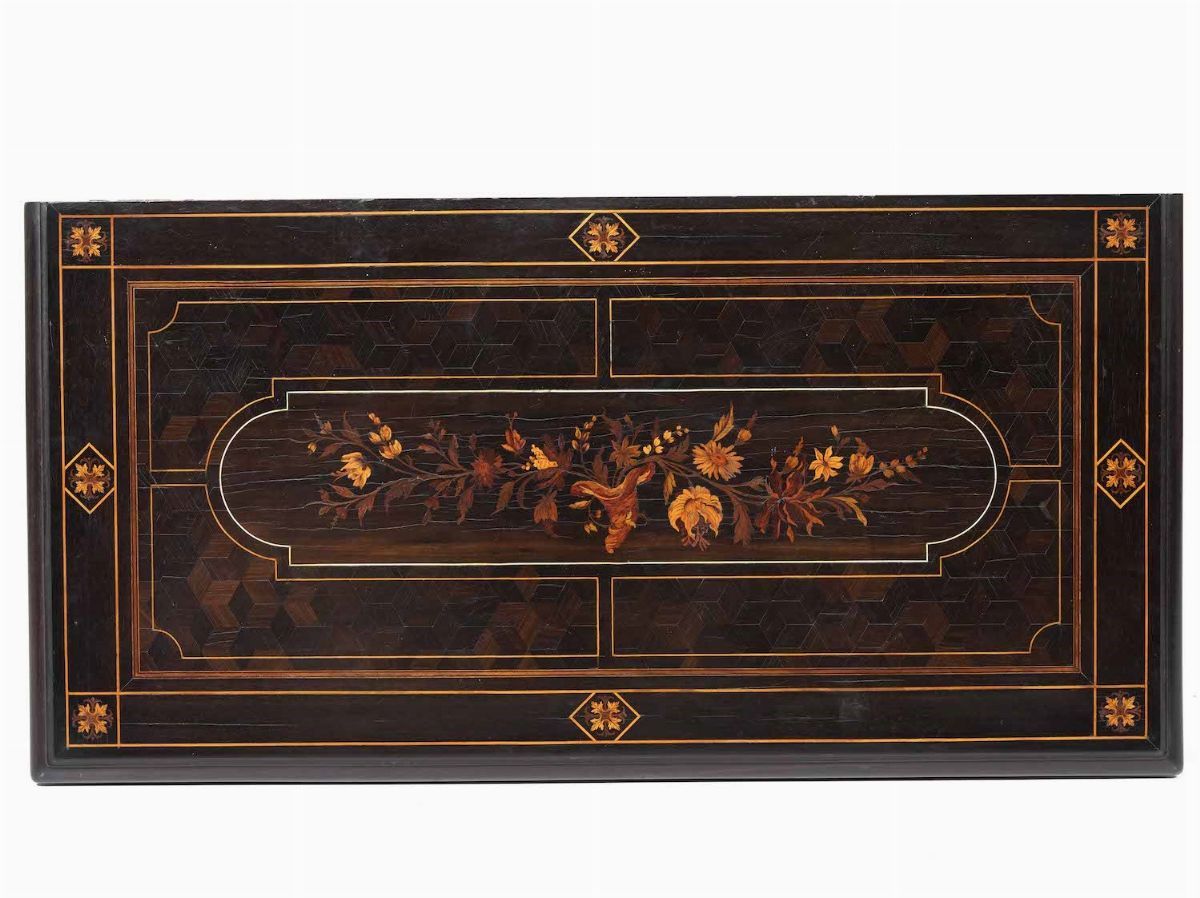 Tavolo da gioco inlegno lastronato ed intarsiato in varie essenze. XIX secolo