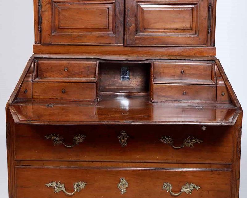base a due cassetti, calatoia celante cassettini e vano a giorno centrale centrato da specchietto che cela vano segreto
