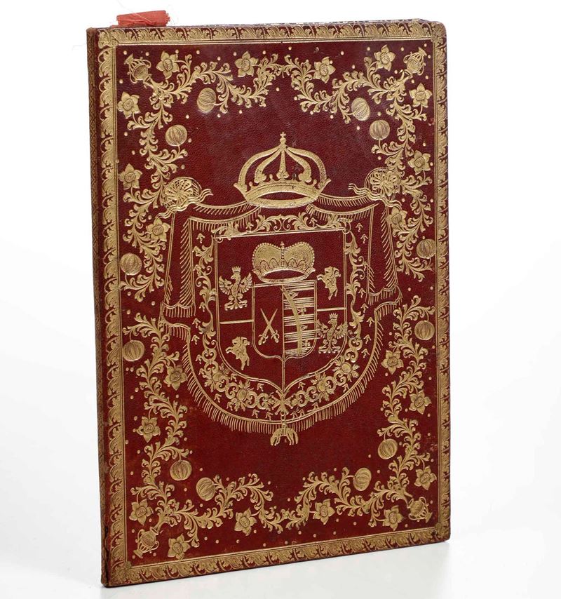 In 4°. Elegante manoscritto cartaceo. Rilegatura in marocchino rosso con ricche decorazioni ai piatti e al dorso.