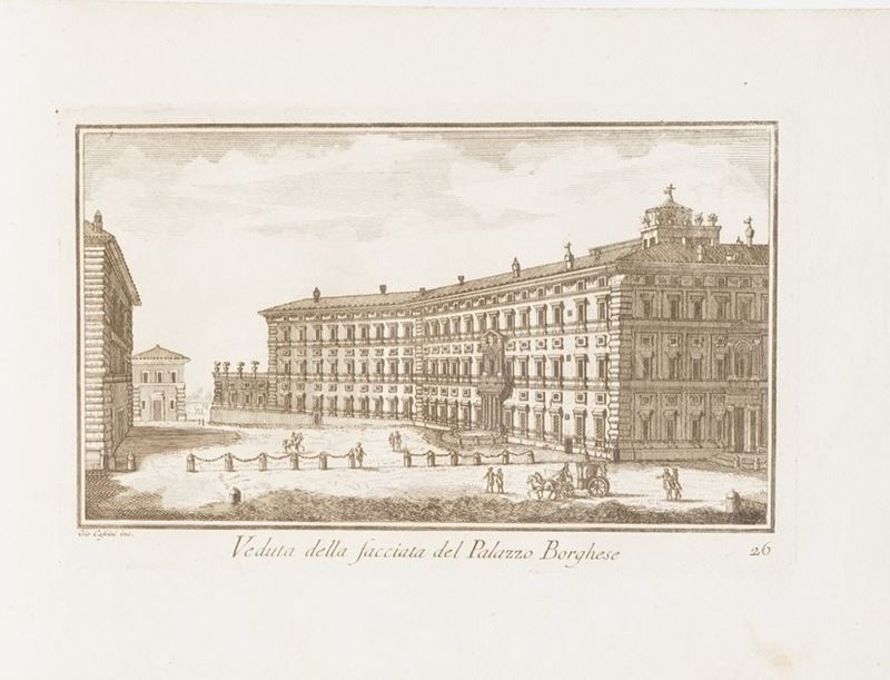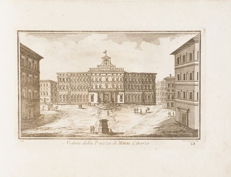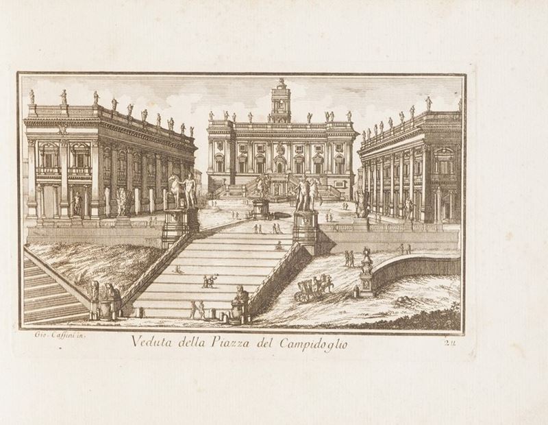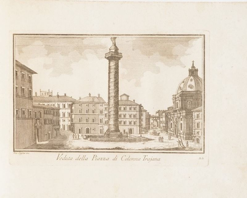 In-4° oblungo. Rilegatura in mezza pelle del secolo XIX. Titoli in oro al dorso. Bella raccolta di 80 incisioni in rame raffiguranti scorci della Roma antica e moderna. Al contropiatto anteriore è applicato un talloncino del rilegatore "Cesare Fumero legatore di libri in Torino"