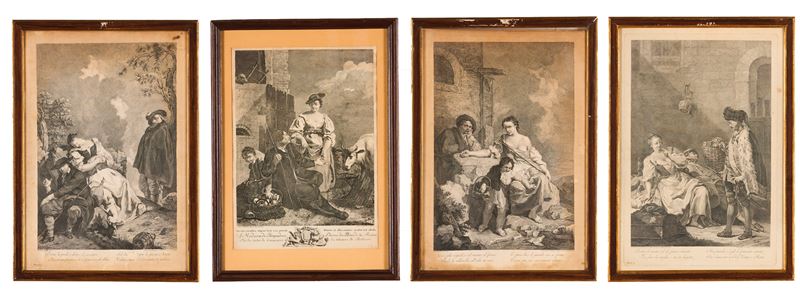 Al piede di ciascuna delle quattro incisioni è riportato un proverbio. Lievi bruniture e tracce d'uso, ma nel complesso buoni esemplari. Entro cornici moderne.