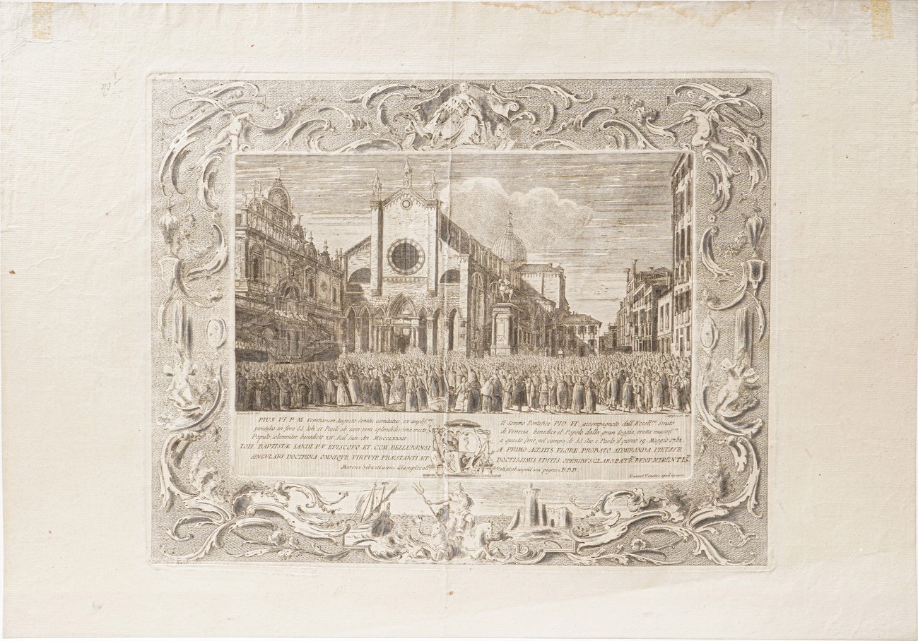 Giampiccoli Marco Sebastiano. Ingresso dell'arsenale e veduta di Campo Santi Giovanni e Paolo, durante la visita di Pio VI.
