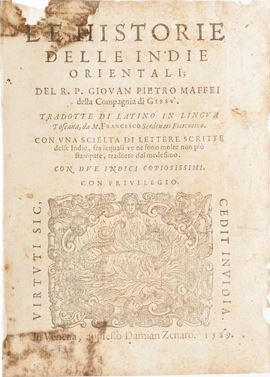 Maffei Giovan Pietro Le historie delle Indie Orientali...tradotti di latino in lingua toscana da Francesco Serdonati fiorentino...in Venezia, appresso Zenaro, 1589.